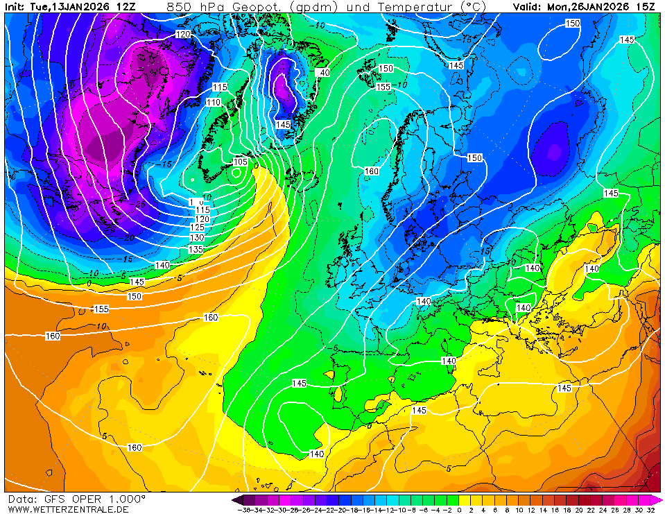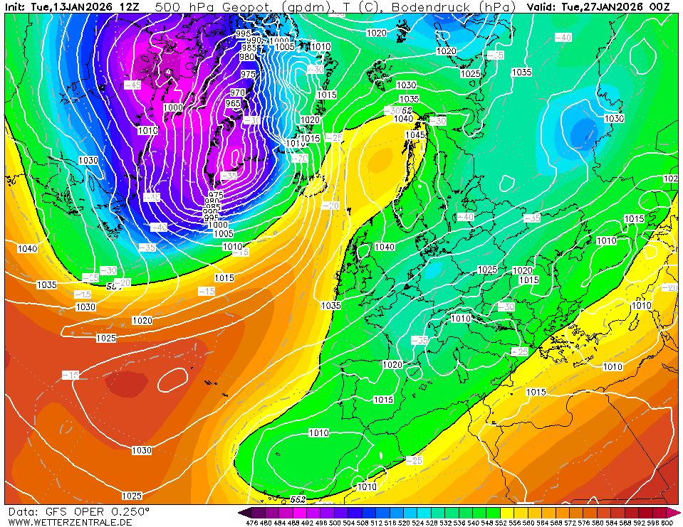 GFS 12z oper 13 januari 2026, Tx / Tn overzicht