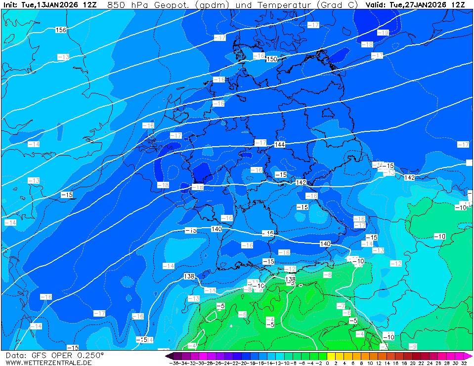GFS 12z oper 13 januari 2026, Tx / Tn overzicht