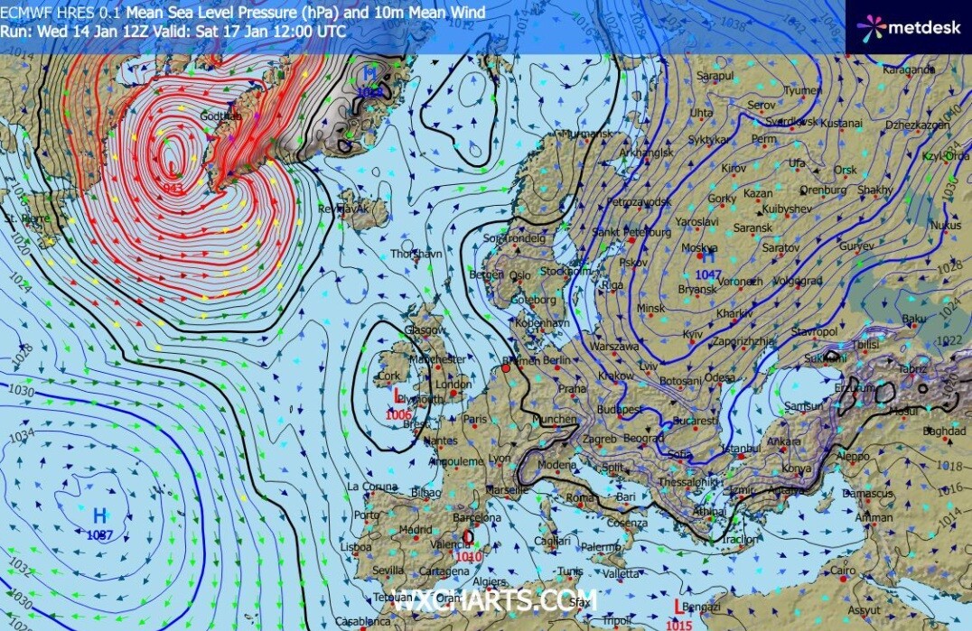 EC oper 12Z op 72 uur. Sterk hoog versus diep laag