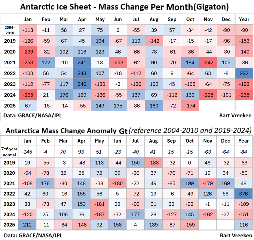 In oktober 2025 was er een fors massaverlies: 174 Gigaton. Daarmee is de kans dat het hele jaar een positieve massabalans heeft een stuk kleiner geworden, maar dit lijkt nog steeds meer dan 50%.