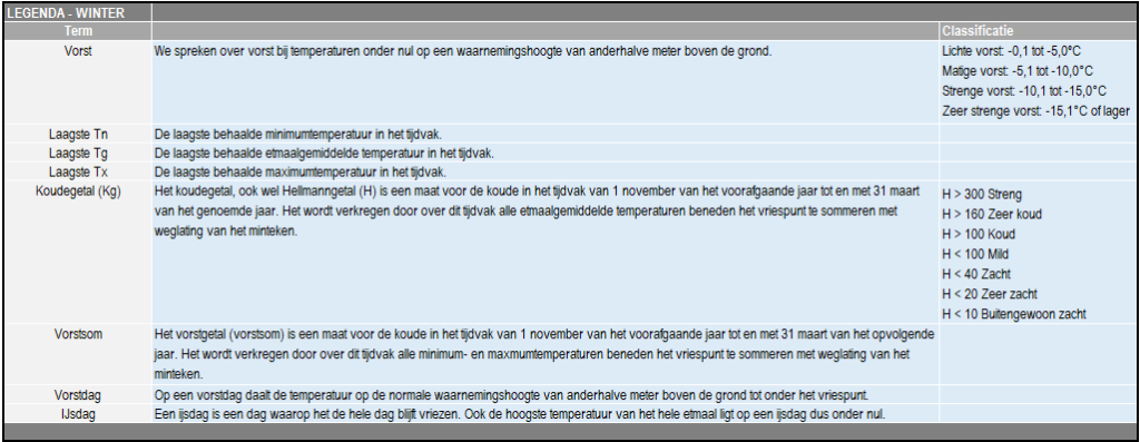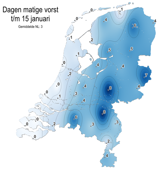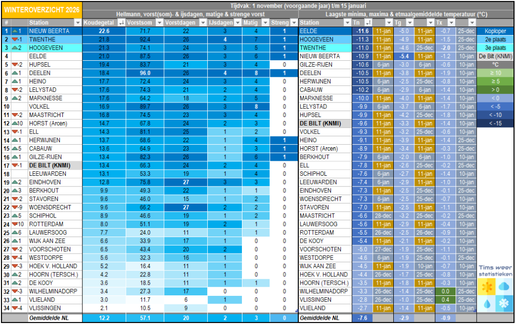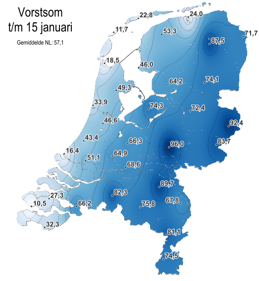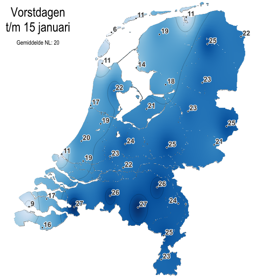 Nieuw Beerta neemt de leiding over van Twenthe met 22,6 koudegetalpunten. Daarmee is ook het maximale koudegetal van de vorige winter (24-25) verbroken, namelijk 19,4 in Nieuw Beerta. Deelen gaat nog altijd aan kop met nu een vorstsom van 96,0. Opvallend is dat het zuid- en oostelijke stations de meeste vorstdagen hebben genoteerd, Eindhoven en Woensdrecht staan op 27 vorstdagen, gemiddeld in het land 20 dagen waarvan 3 dagen matige vorst. Op 6 en 11 januari kwam het op 8 stations tot strenge vorst. In het noordoosten was het op 11 januari het koudst met in Eelde -11,6°C. Dit is de laagste tempertuur sinds 14 februari 2021. In Nieuw Beerta werd dezelfde dag een etmaalgemiddelde temperatuur van -5,4°C genoteerd. De laagste maximumtemperatuur, -2,0°C blijft staan op 1e kerstdag in Twenthe. Gemiddeld staan we op 2 ijsdagen, Twenthe en Deelen op 4.