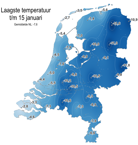 Met een gemiddelde temperatuur van 4,7°C in De Bilt tegen 4,1°C normaal verloopt de eerste helft van de winter (1dec t/m 15 jan) qua temperatuur aan de zachte kant. December was m.u.v. de kerstdagen weliswaar veel te zacht, maar de eerste helft van januari verliep zo'n 2 graden kouder dan normaal.