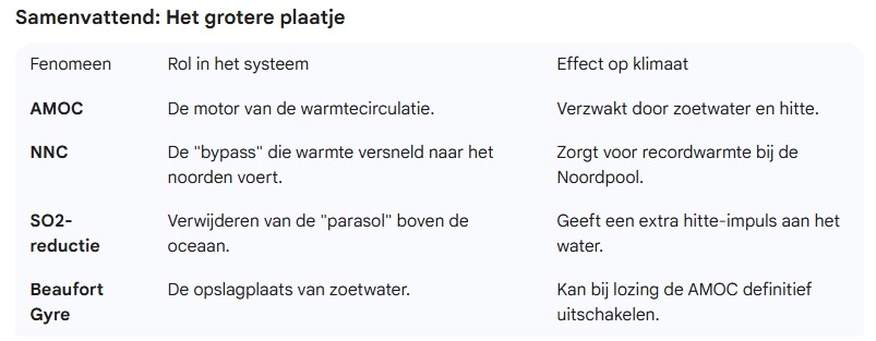 De conclusie: We zien een kettingreactie. De SO2-reductie warmt het water op, de NNC brengt die warmte naar het noorden, de Beaufort Gyre vult zich daardoor sneller met smeltwater, en als die gyre leegstroomt, valt de AMOC-motor stil. Dit verklaart waarom de huidige veranderingen in de Noord-Atlantische regio veel sneller en extremer verlopen dan oude computermodellen voorspelden.