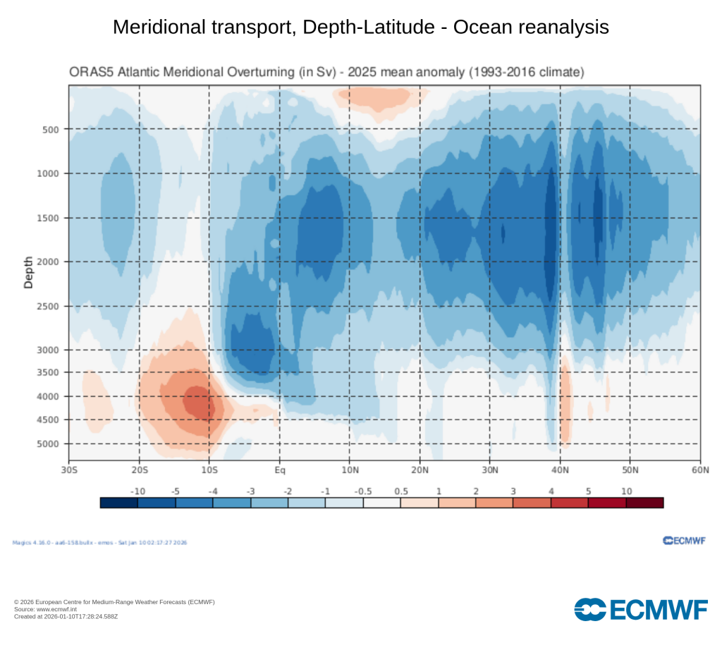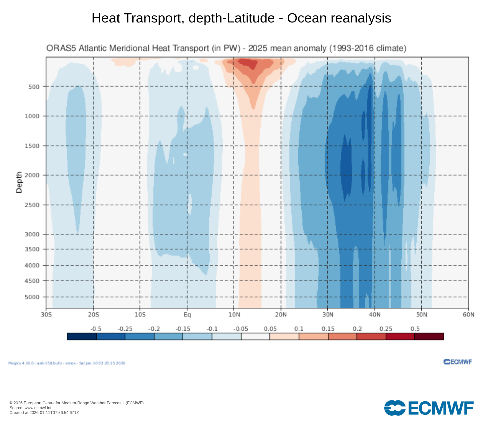 De laatste jaren duidelijke afname in de diepte van water en warmte transport op de ORAS5 kaarten van EC. Vooral 2025 is opvallend met een ophoping van warm water op 10/15°N met kolom die plots tot zeer diep gaat reiken. Terwijl vorige jaren dit nog niet zo opvallend was buiten een stevige piek in 2018 en poging tot in 2021. Afbeelding 1 PW transport en afbeelding 2 SV transport. ECMWF | Charts