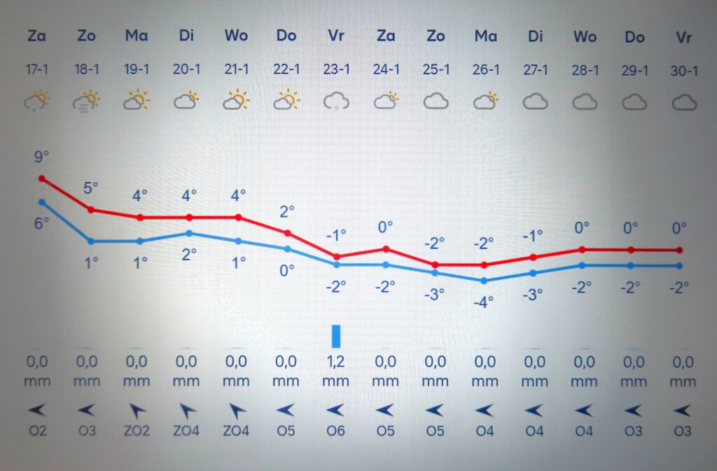 Morgen meteen al een paar graden boven nul en daarna verder, dit ziet er heel anders uit dan de verleden sneeuwdagen.