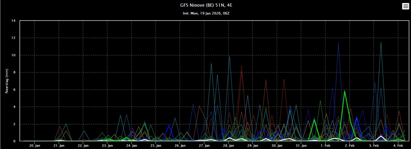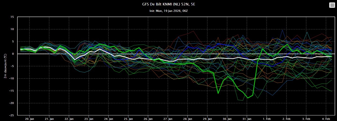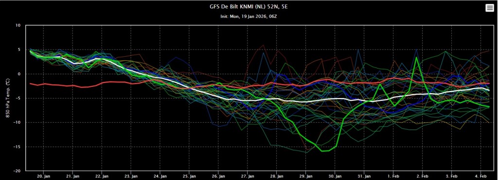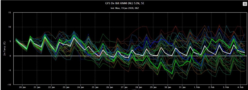 De eerste dagen lijken de temperaturen vrij normaal te zijn voor de tijd van het jaar. Daarna koelt het af met uiteindelijk lichte vorst in de nacht en overdag een paar graden in de plus.