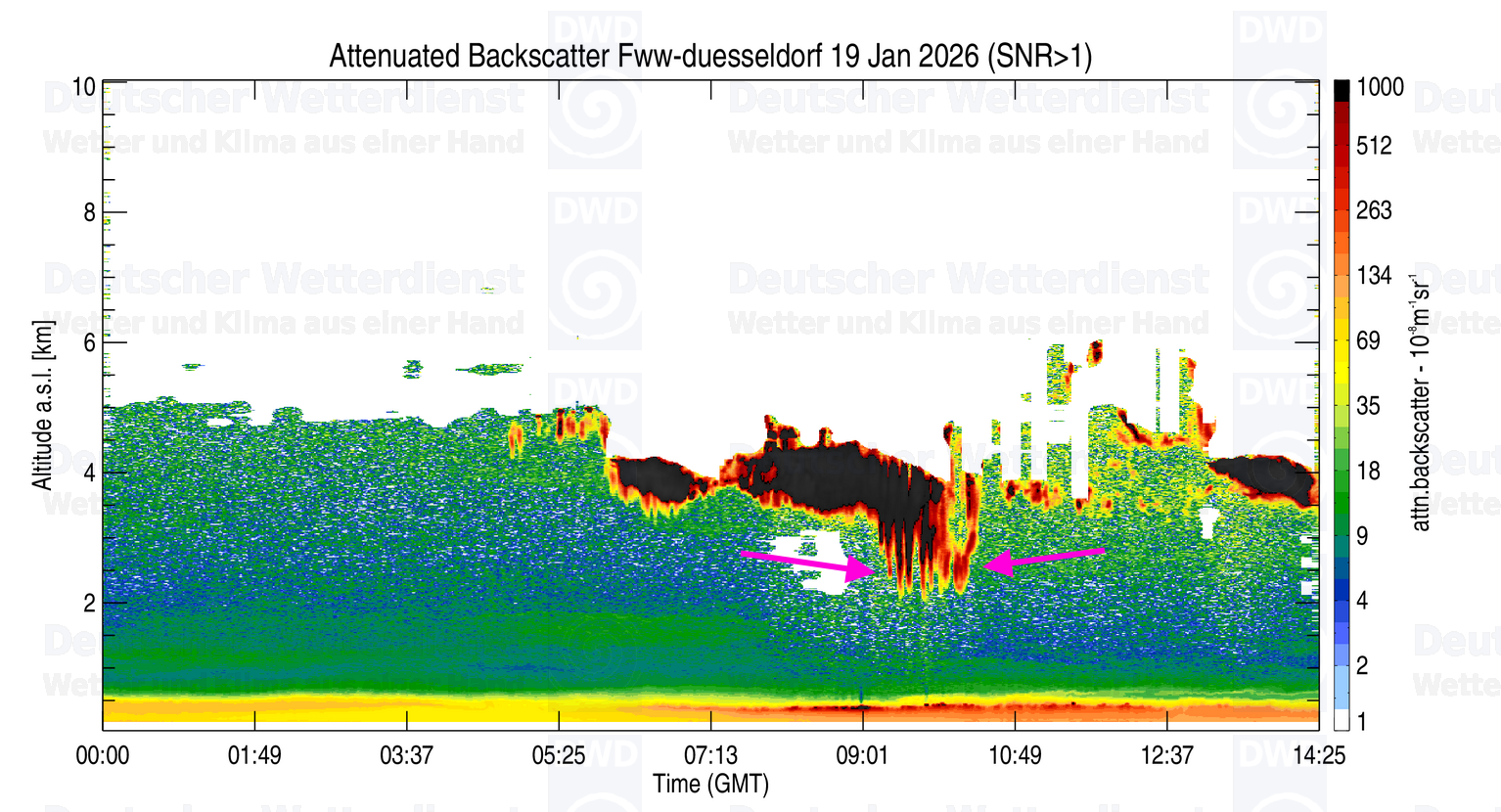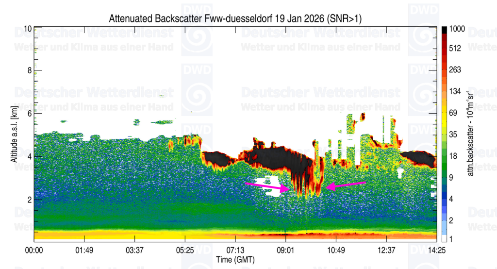 Zit een trogje hogerop waar de bewolking ontstond (rond de 4km hoogte). Duidelijk uitsneeuwende Ac toen de bewolking over de wolkenhoogtemeter (LIDAR) van Düsseldorf trok, zie paarse pijlen.