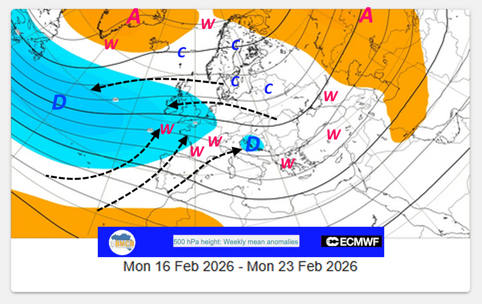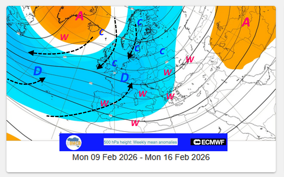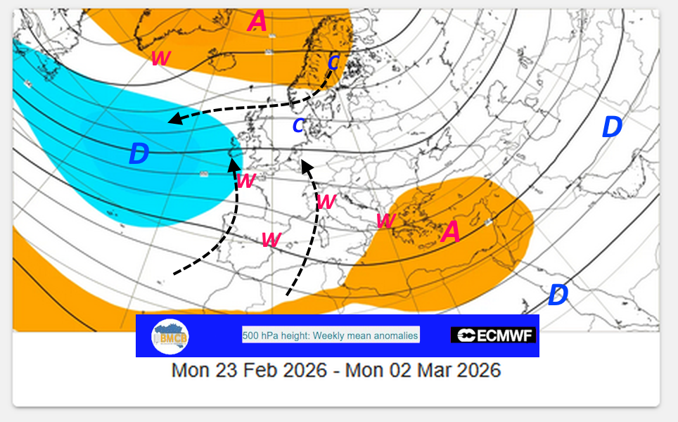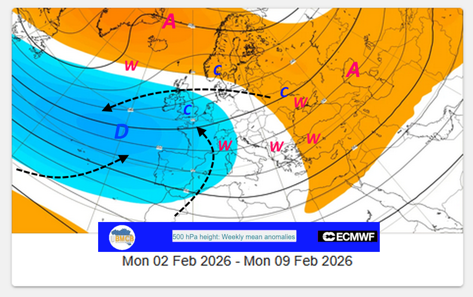 De ensembleverwachtingen van het ECMWF schetsen, in het licht van de anomalieën in de middelbare troposfeer, voor de eerste decade van februari een groots atmosferisch schaakspel, gekenmerkt door uitgesproken contrasten. Enerzijds zou een uitgestrekt lagedrukgebied zijn invloed laten gelden van de Atlantische Oceaan tot over Frankrijk en het Iberisch Schiereiland. Anderzijds blijven krachtige hogedrukgebieden zich vastzetten van Groenland tot Zuid-Rusland en het Midden-Oosten, via Scandinavië, en vormen zij een robuuste en hardnekkige barrière.