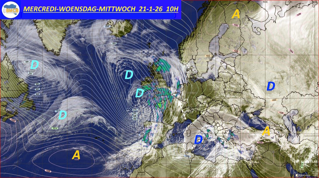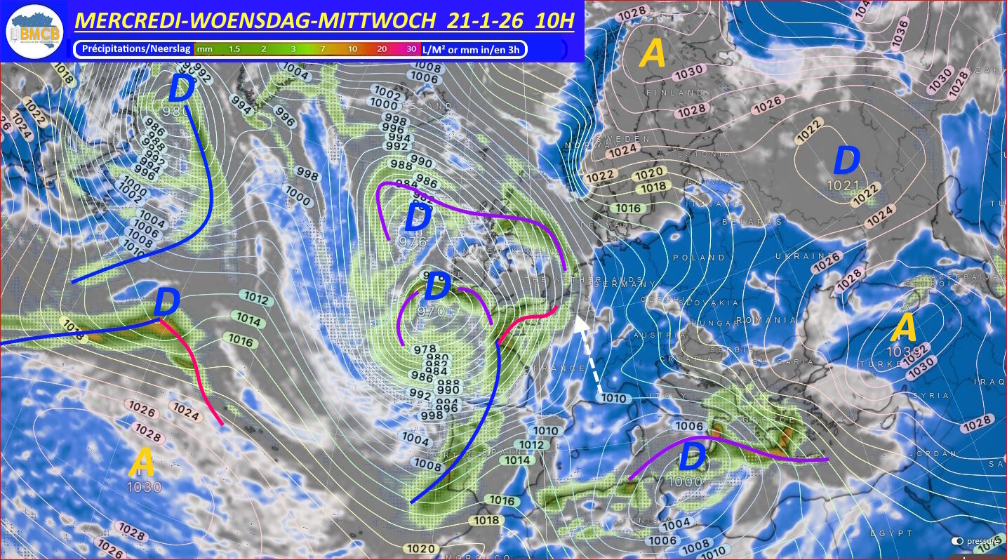 Dit rustige intermezzo lijkt echter van korte duur. Vanaf dinsdag bereiken storingen verbonden aan een diepe oceaandepressie van circa 956 hPa de Britse Eilanden en Frankrijk, om later ook onze regio's te beïnvloeden. De neerslag kan aanvankelijk vallen als natte sneeuw of sneeuw, maar gaat geleidelijk over in regen naarmate zachtere oceaanlucht terrein wint.
