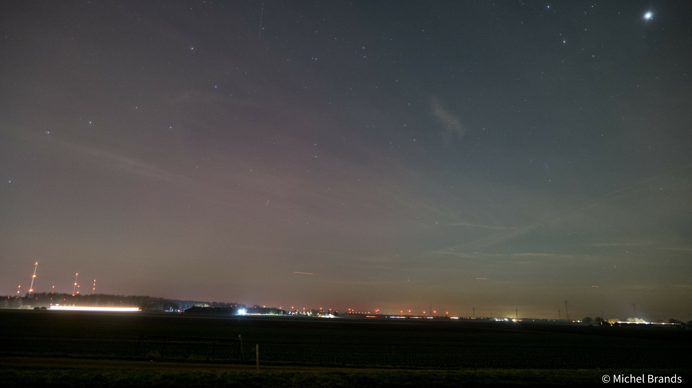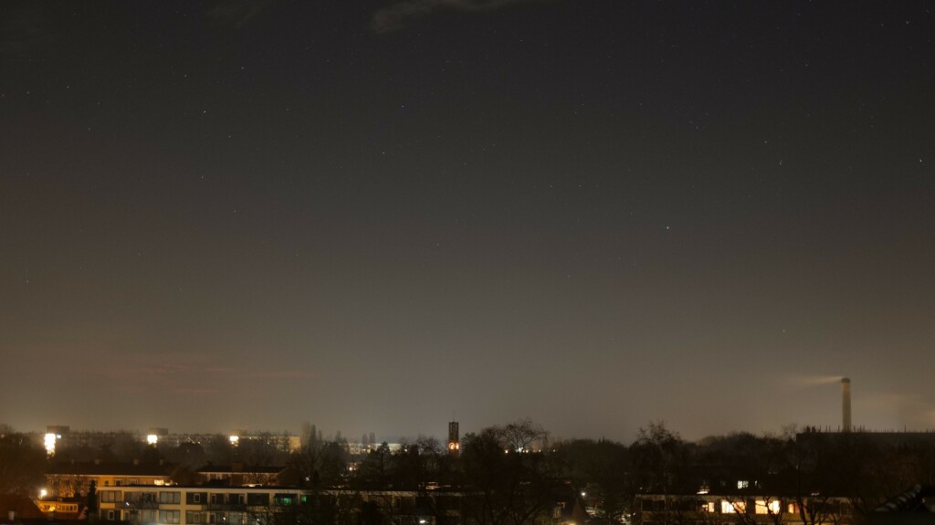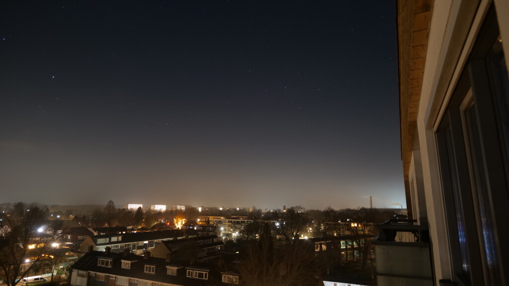 Ik probeerde toen in de kou (iets boven of rond het vriespunt) in mijn slaapkloffie en op mijn blote voeten nog wel op mijn balkon even een fotootje te maken, rond kwart over twee, maar daarop was natuurlijk maar weinig te zien (zie eerste afbeelding).