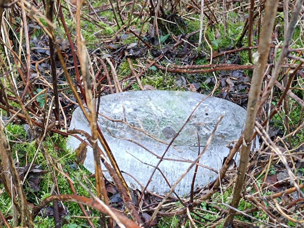 Nee, al lang niet meer. Hier heeft regen de sneeuw snel doen smelten. Maar wat ligt daar langs de bosrand op de helling ? Is dat een blok ijs ? Ik kan er niet bij.