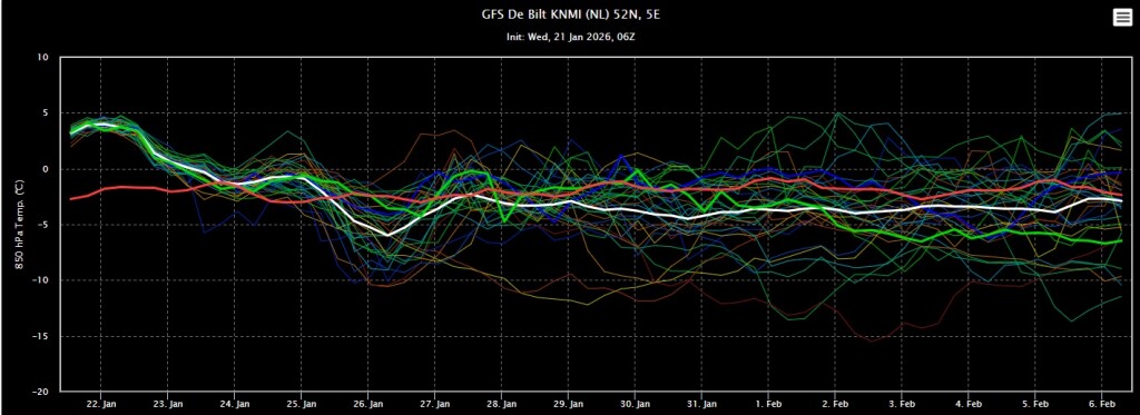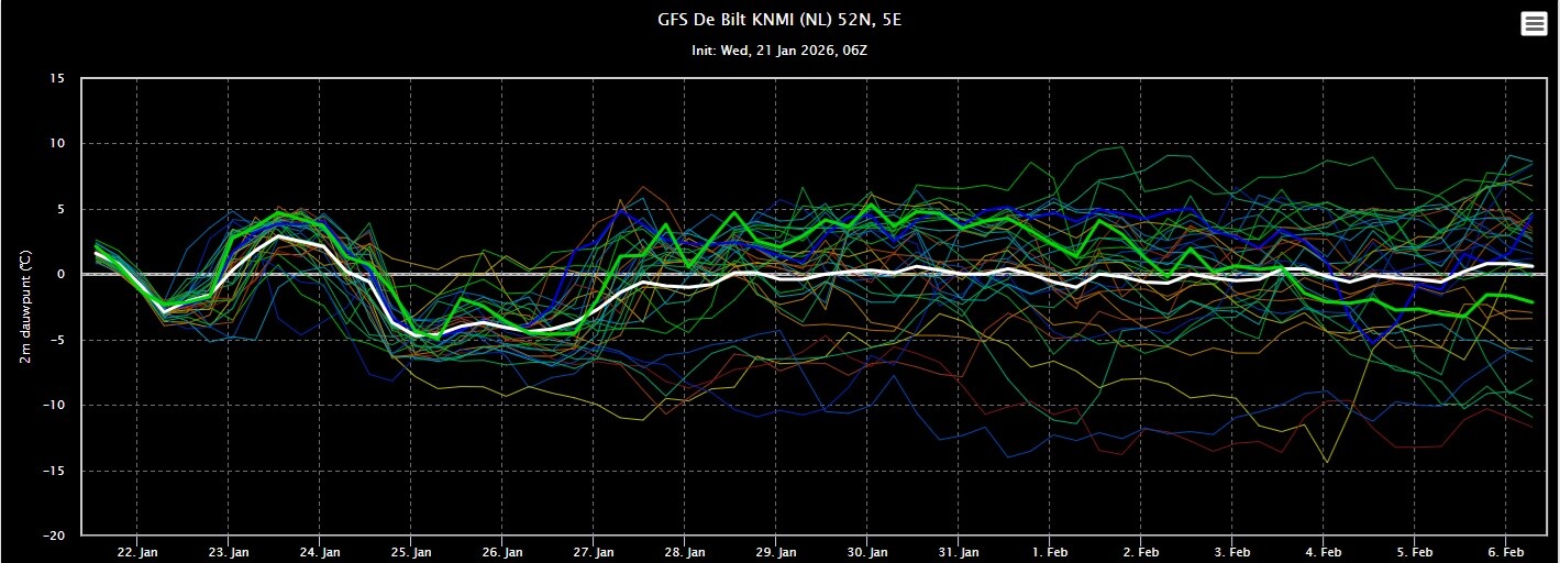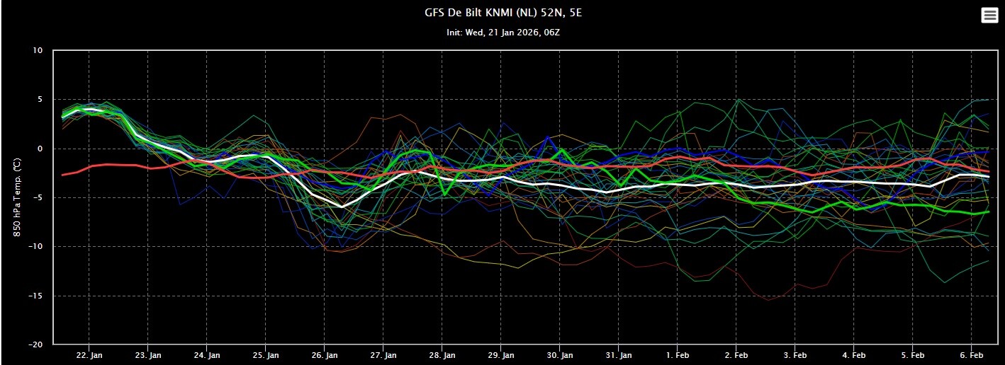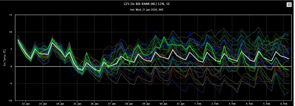 Voor de temperatuur betekent dat dat we in eerste instantie normale tot iets te hoge temperaturen hebben en dan vooral de komende nachten. Daarna een aantal dagen vrij koud winterweer en vanaf de 28e ligt de temperatuur op een normaal niveau.