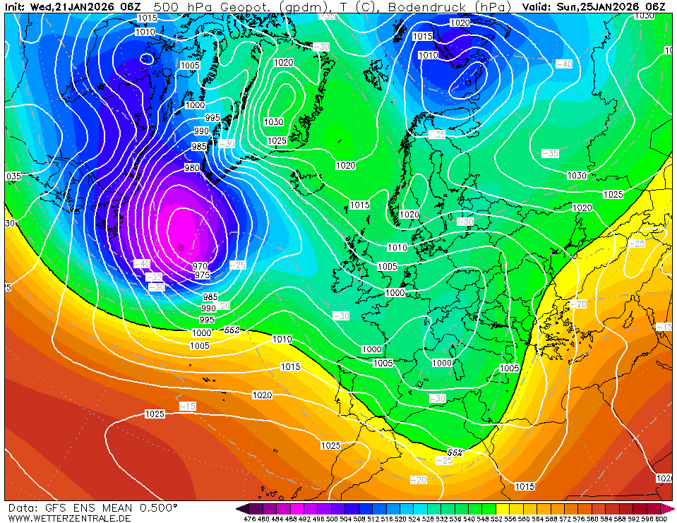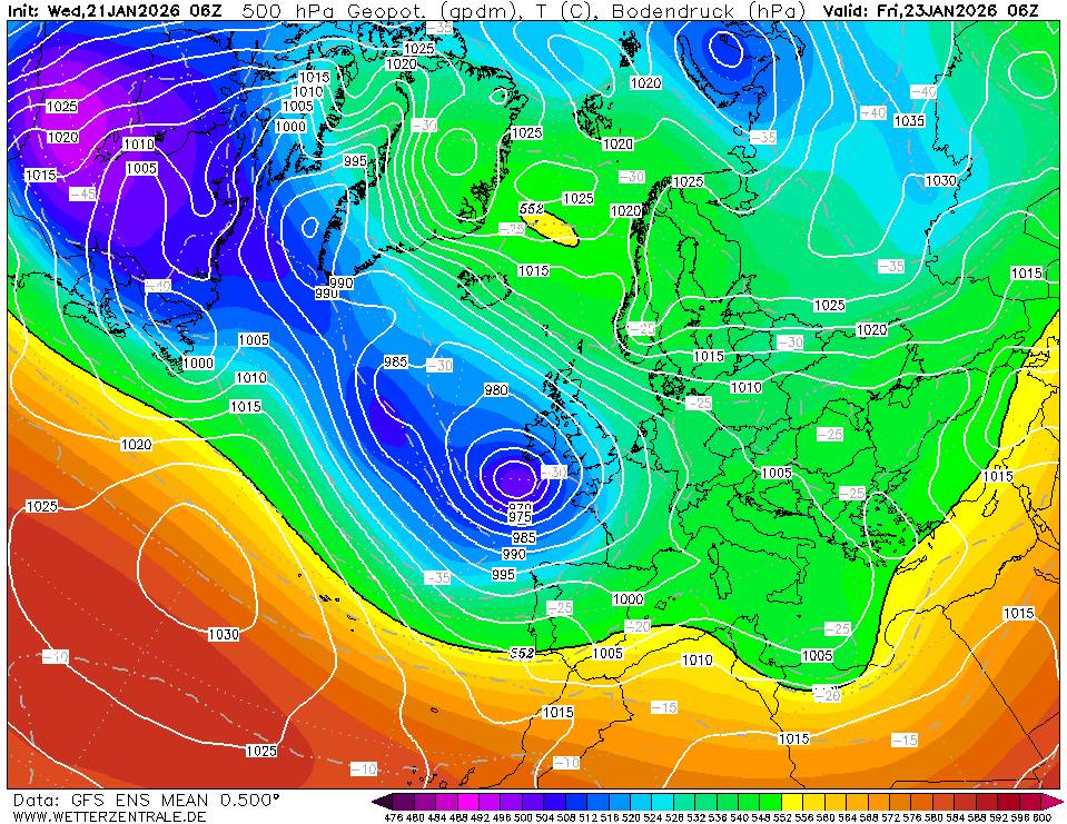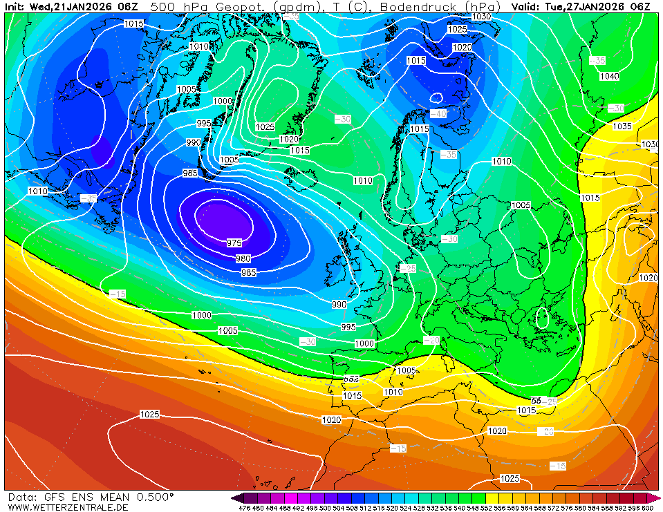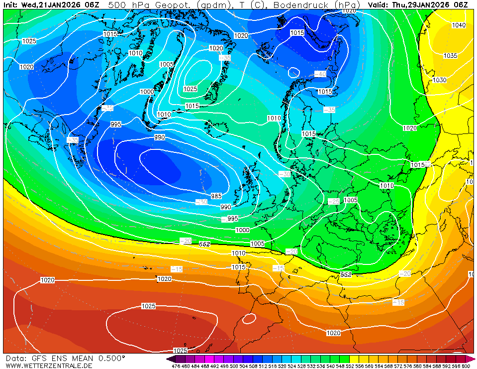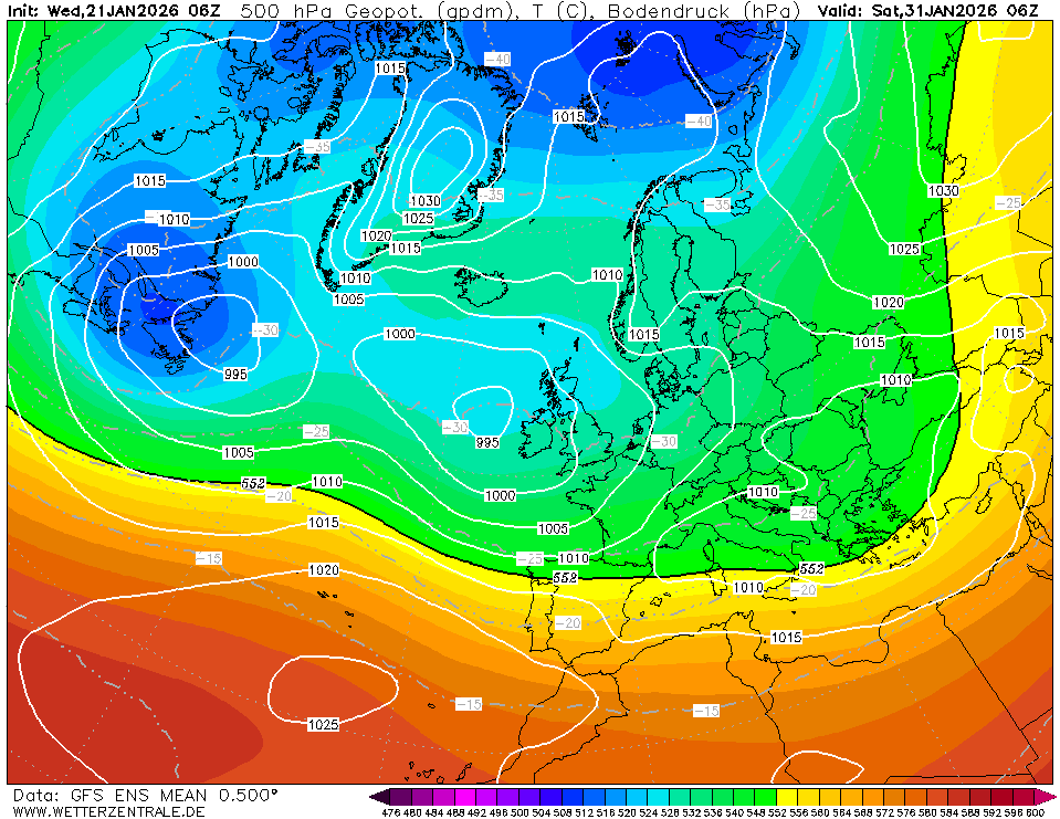 Het hoog blijft in eerste instantie op zijn plaats, maar wordt in het middengedeelte wel zwakker door een afzakkend laag vanaf het poolgebied. Het laag ten westen van Frankrijk vult tegelijkertijd wat op.