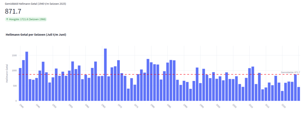 Ik woon hier nog te kort om daar een goed gevoel bij te hebben. Ik heb wel een database gemaakt met alle data uit deze regio. Eigenlijk is het meetpunt iets meer naar de kust, dus mijn waarde zijn net iets kouder. Geeft wel een aardige indruk. Goed te zien dat de winters hier veel milder zijn geworden. In de winter 2023-2024 had ik als eindwaarde 1127