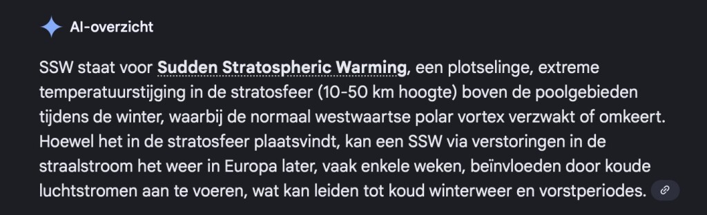 SSW staat voor Sudden Stratospheric Warming, een plotselinge, extreme temperatuurstijging in de stratosfeer (10-50 km hoogte) boven de poolgebieden tijdens de winter, waarbij de normaal westwaartse polar vortex verzwakt of omkeert. Hoewel het in de stratosfeer plaatsvindt, kan een SSW via verstoringen in de straalstroom het weer in Europa later, vaak enkele weken, beïnvloeden door koude luchtstromen aan te voeren, wat kan leiden tot koud winterweer en vorstperiodes.