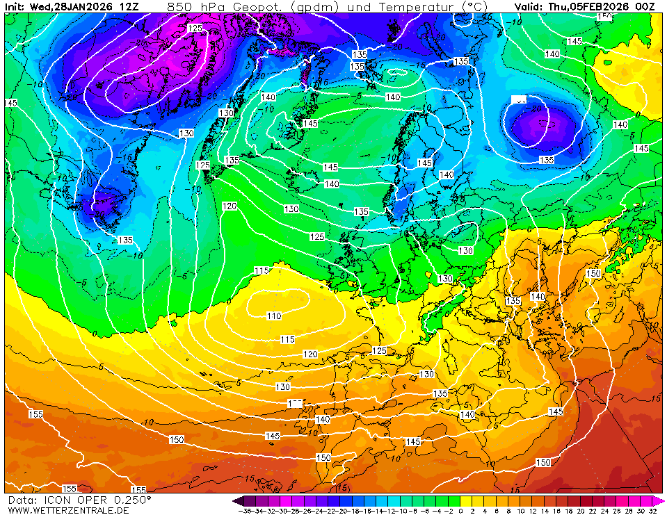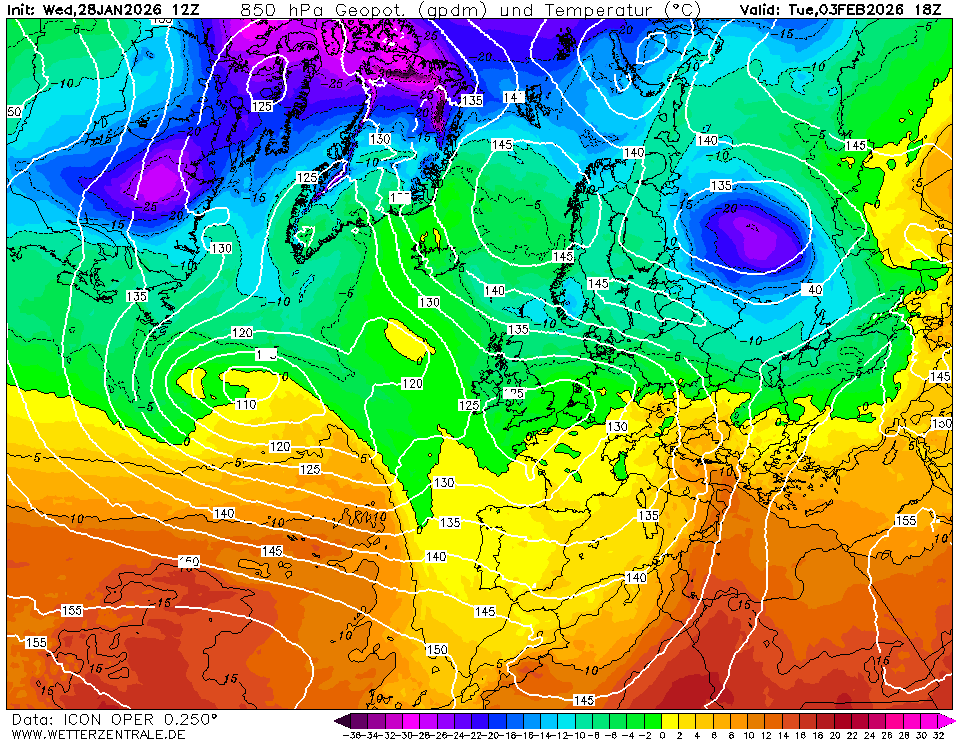 Maandag begint nog vrij zacht, maar tegen het eind van de avond zit een groot deel van Nederland in de vorst. Dinsdag zelfs niet warmer dan 0 graden in De Bilt dus mogelijk een ijsdag en lokaal in Groningen een Tx van -3 graden. Alleen Limburg tikt de 5 graden aan, maar verder blijft het in heel Nederland vrij fris met zo'n 2 a 3 graden. Woensdag kantelt de storing op de oceaan wat waardoor we weer grote tegenstellingen krijgen met in het zuidoosten 10 graden en in Groningen 3 graden. Maar het ziet er niet per se kansloos uit wat betreft het vervolg (na 180u).