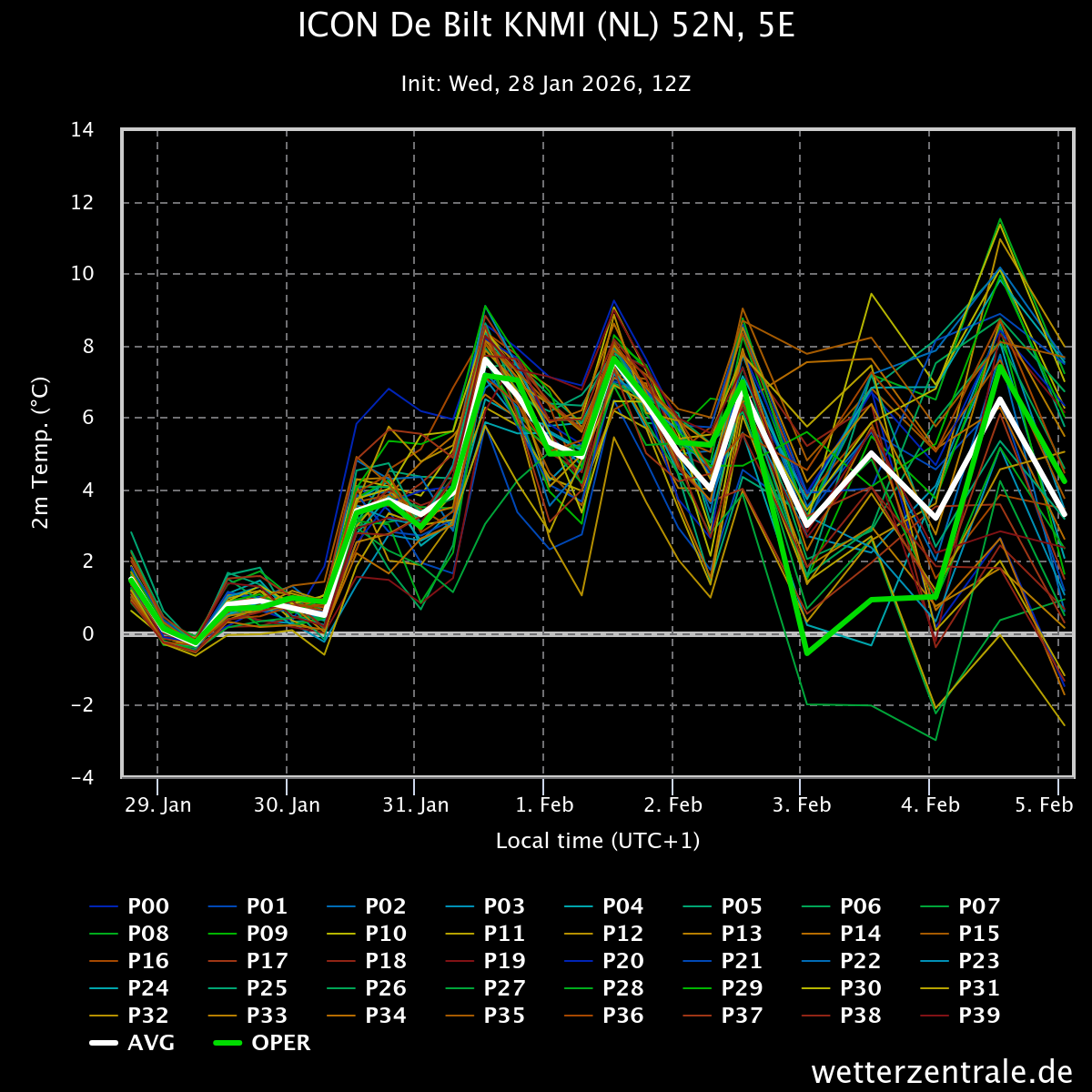 In vergelijking met de 00z versie is de maximale T2m op maandag, dinsdag en woensdag gegaan van 7.1, 7.8, 8.4 graden (00z) naar 6.8, 5.0, 6.5 graden (12z). Dus wel een behoorlijke afkoeling van ruim 2 graden voor die dagen. De onzekerheid is ook flink toegenomen. In de 00z pluim zaten 88% van de leden voor volgende week woensdag binnen 3 graden van het gemiddelde. In de nieuwe pluim hieronder is dat slechts bij 58% van de leden het geval.