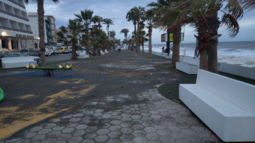 De Paseo is wel een paar keer door golven overstroomd. Daardoor veel zand op de boulevard.