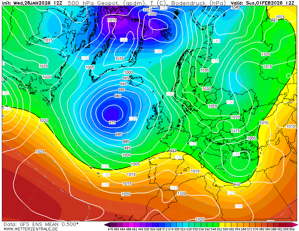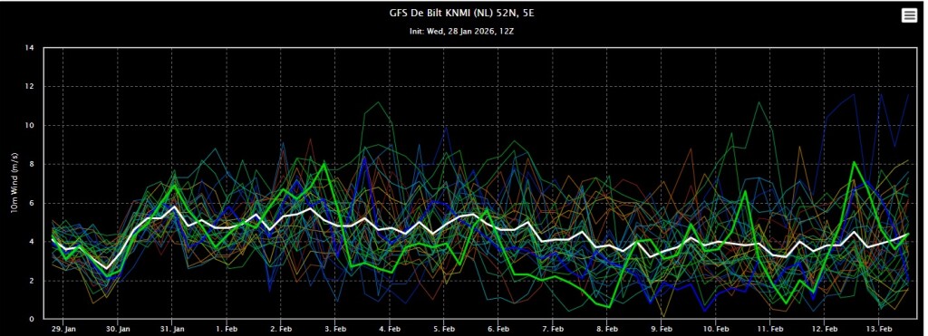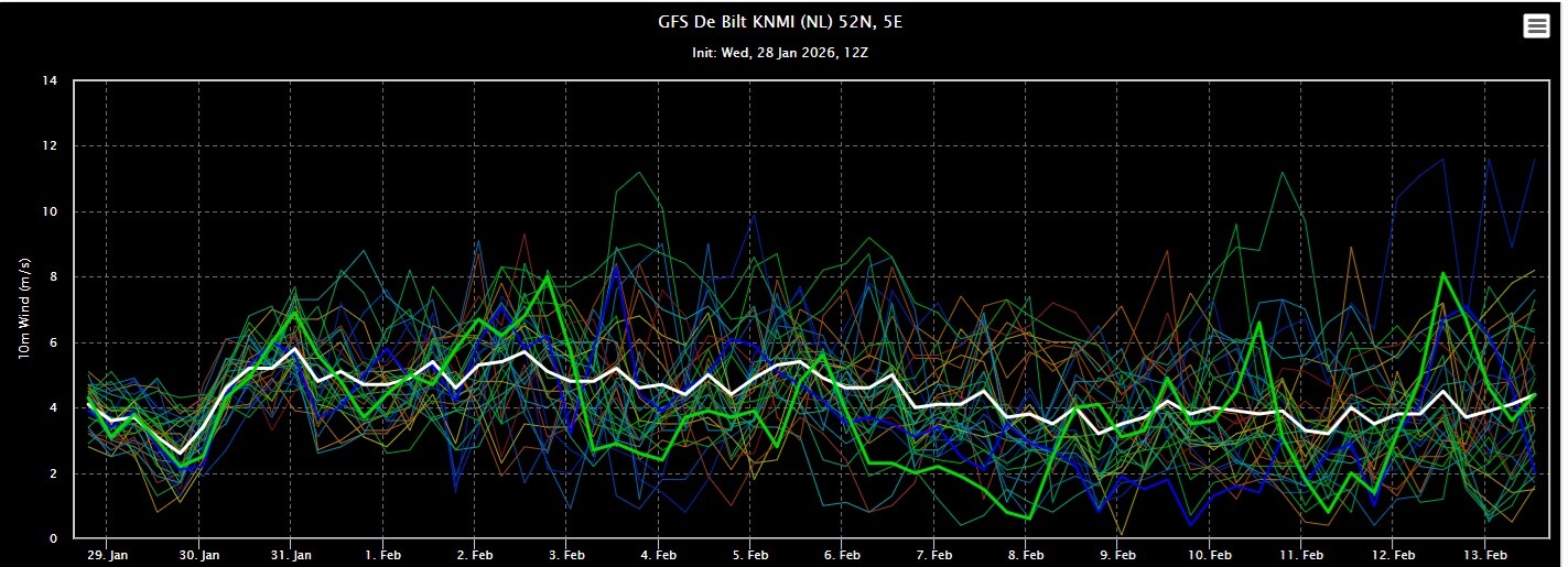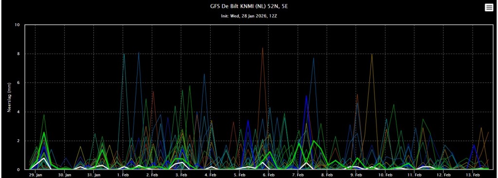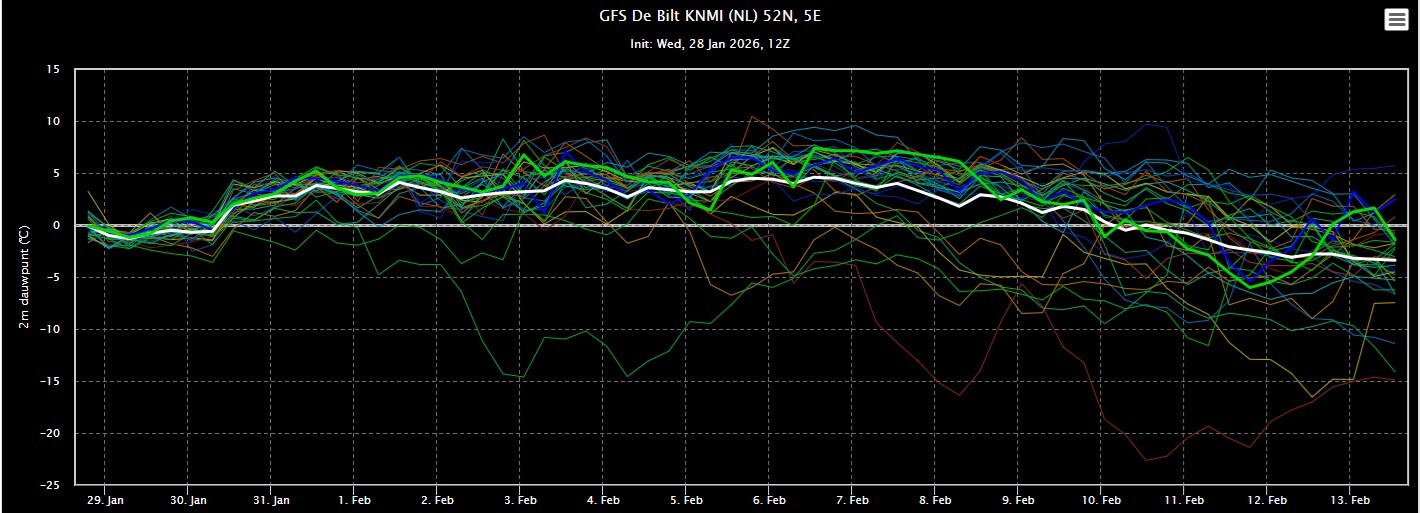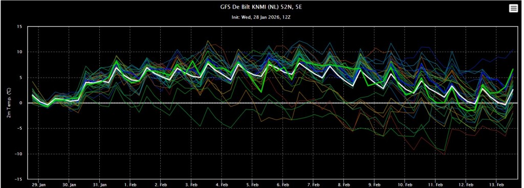 De ensembles van GFS zijn de laatste paar runs zonder uitzondering overgegaan op een zacht scenario de komende tijd. Zowel overdag als in de nachten zal de temperatuur boven het langjarig gemiddelde schommelen