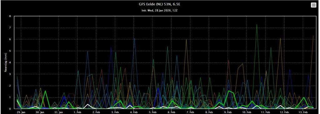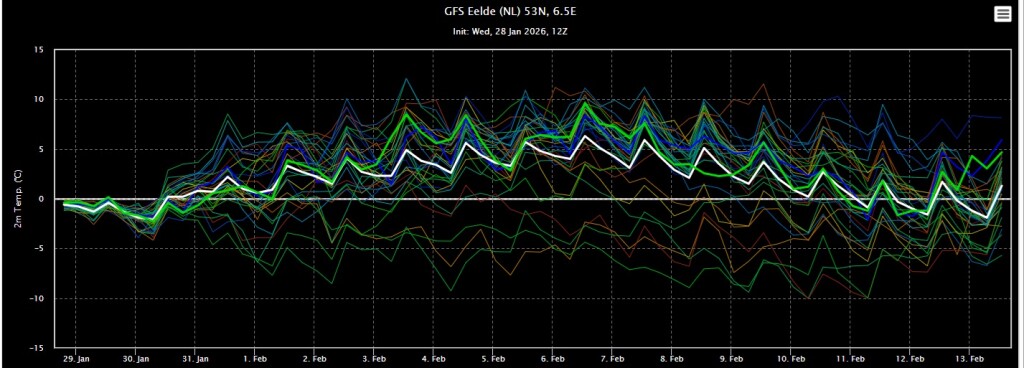 Vanaf zondag komt het kwik boven het vriespunt en dat zal een periode zo blijven volgens dit ensemble