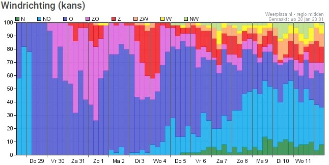 Vrijdag en maandag lijken de meest wind te geven. De wind komt nog steeds hoofdzakelijk uit richtingen tussen oost en zuidoost