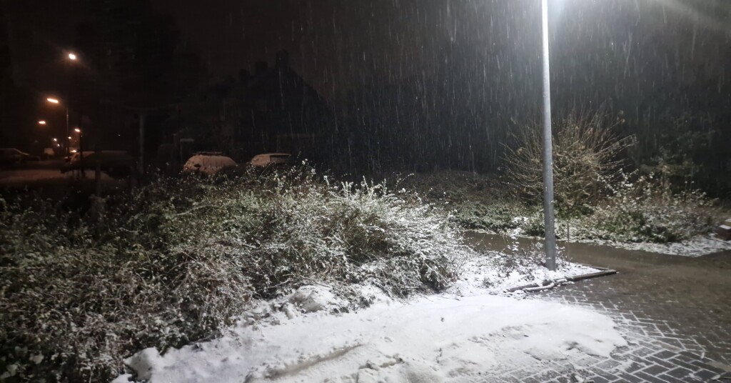 ... (overblijfselen van de sneeuw begin deze maand - zie onderaan de foto) wordt ook weer aangevuld. Het sneeuwt hier nu al een tijdje gestaag door, licht tot soms matig. De straten zijn nog zwart. De auto's, de daken, de struiken, het gras en de bomen beginnen wel flink wit te worden. Leuke verrassing!