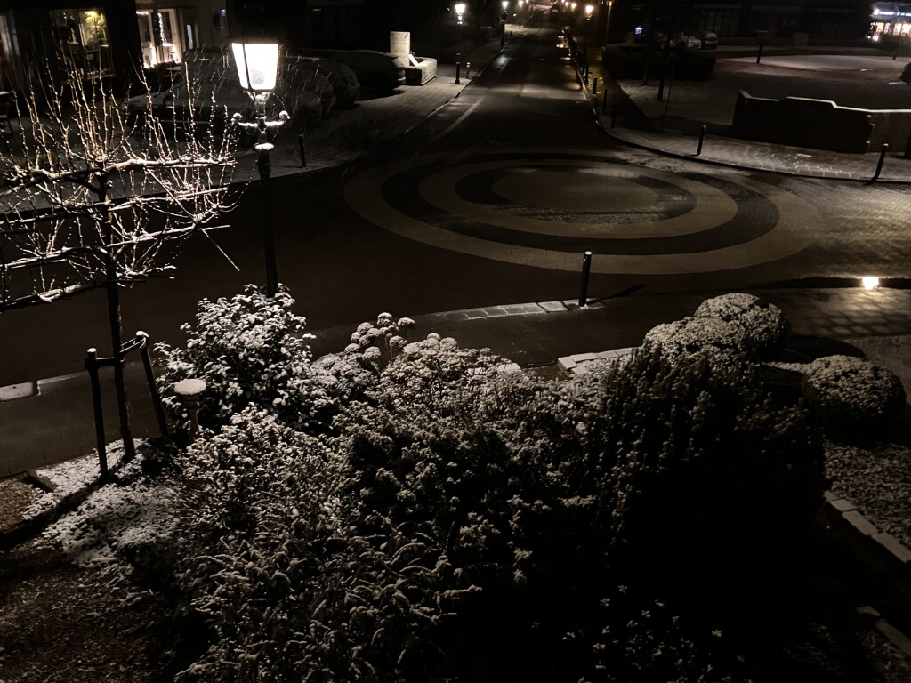 Vanuit het raam geschat, 1-2 cm. Wegen en stoepen deels besneeuwd bij tact -0,5. Op struiken, gras en daken blijft t goed liggen.
