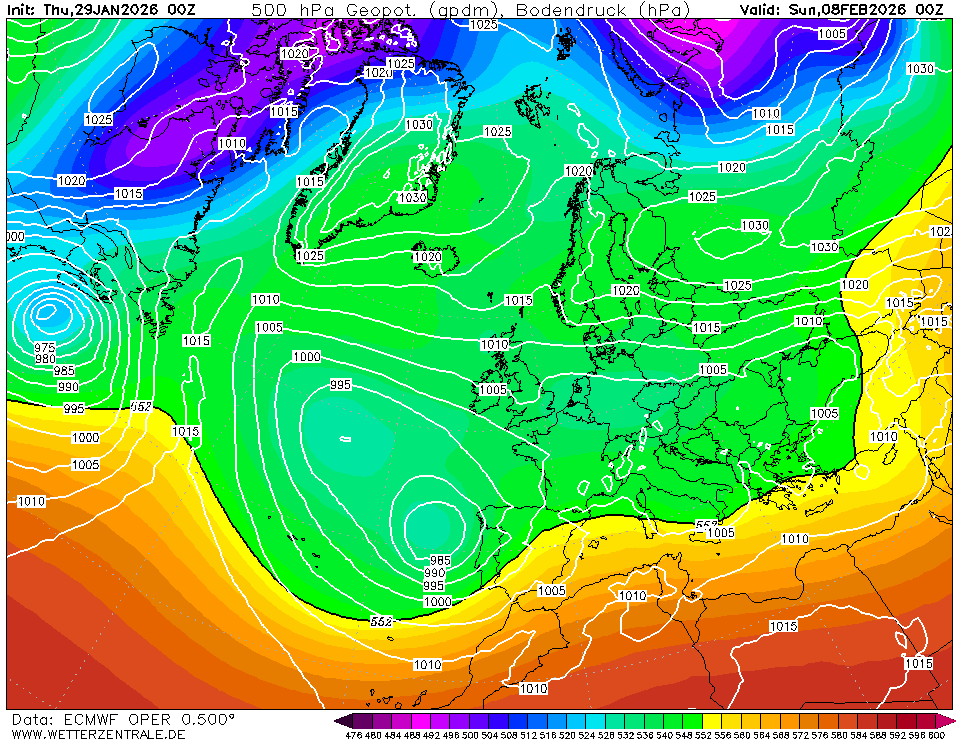 Hogedruk ten N is 1 lange gordel geworden van Groenland tot Rusland. Lagedruk trekt weg richting Ibetisch schiereiland. Wij weer vol in de winter, nu ook in de zuidelijker delen van de Benelux.