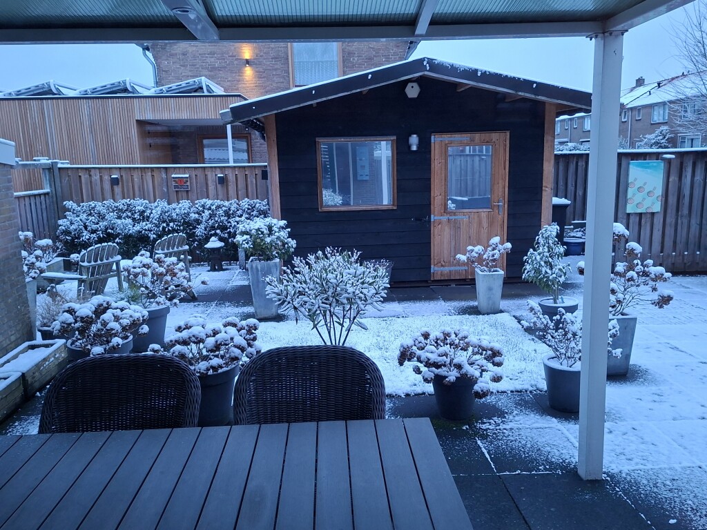 Hier ook lichte sneeuw, heerlijk. 🙂 Tact; -0,4°C.