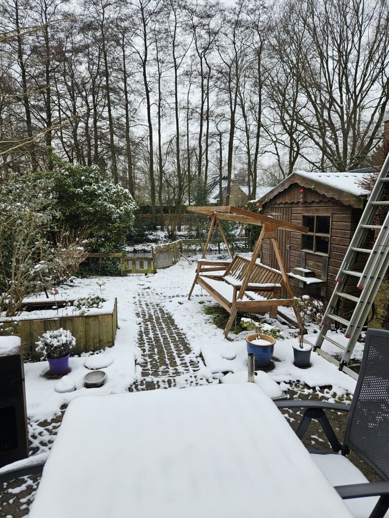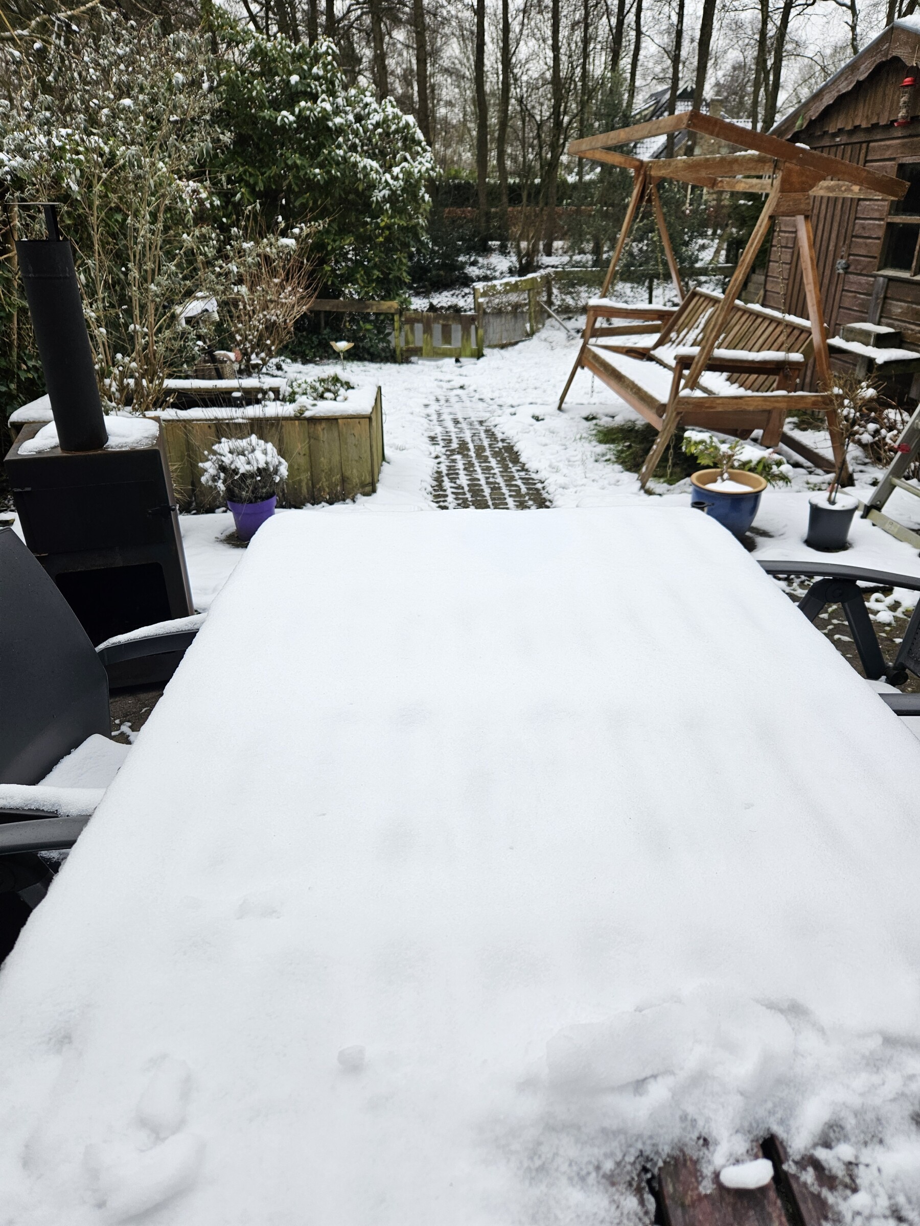 Toch nog best fraai. Tact +0,6 °C maar geen zichtbare dooi. Regen/ijzel nu aanstaande. Ik ben benieuwd of vanavond nog zelfde beeld op tafel ligt. Pakweg 4 cm sneeuw nog.