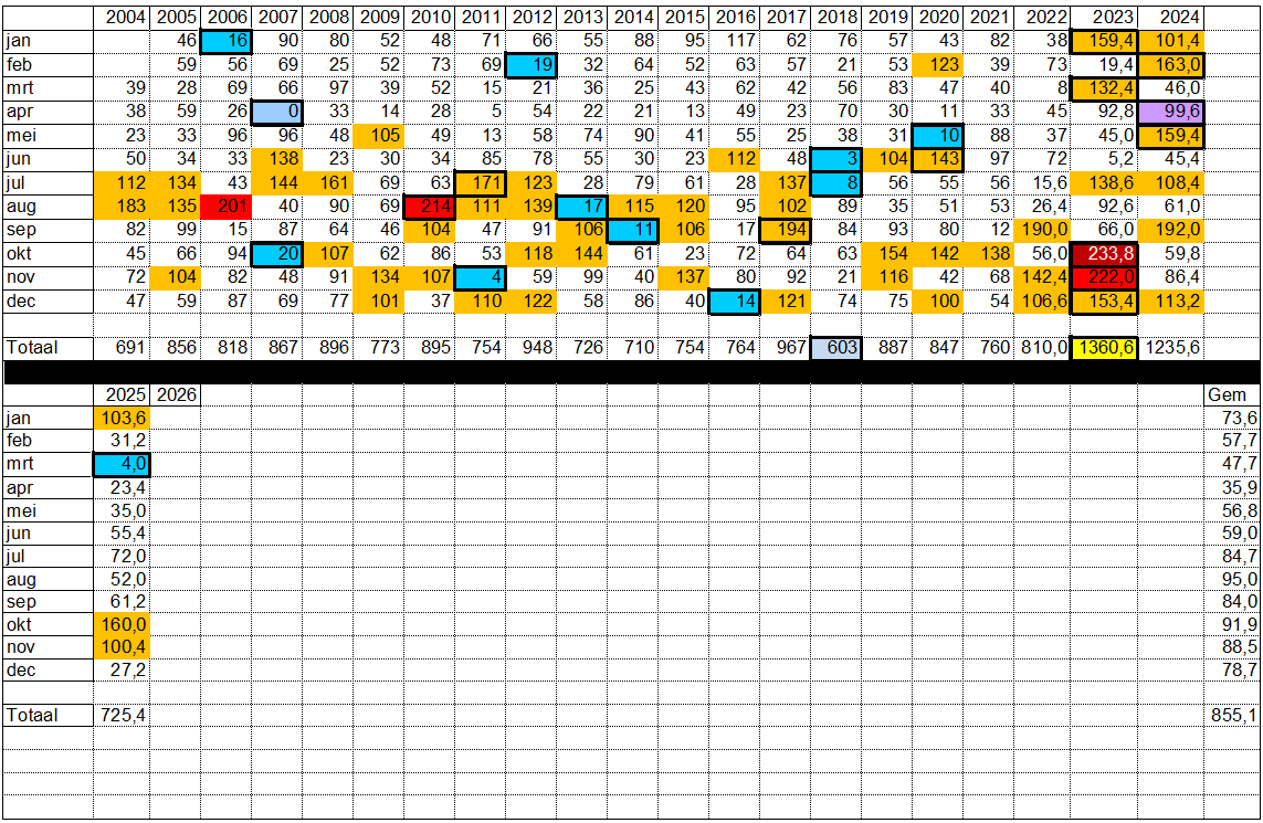 In 2023 en 2024 was 100+ millimeter in januari de aftrap van een zeer nat jaar, maar vorig jaar verliep juist droog.