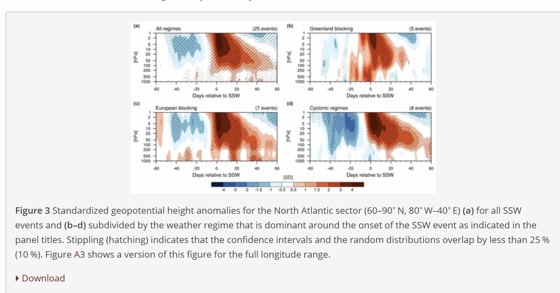"SSW events that occur during Greenland Blocking (Fig. 3b) are associated with an immediate, strongly positive anomaly in the troposphere. Consistent with Fig. A2b, when Greenland Blocking is present around the onset of the SSW, Greenland Blocking or Atlantic Ridge are often already present before the SSW event, which is likely the cause of the positive tropospheric geopotential height anomalies several days prior to the event. Notably, there are no significant and robust (Figs. 3b and A4b) anomalies after 10 d of the onset of the SSW except for a weak negative geopotential height anomaly after 20 d (significant at the 25 % level), indicating a cyclonic flow regime in the North Atlantic/Europe region. This is consistent with the significantly enhanced likelihood for the occurrence of the Atlantic Trough regime at this lag (Fig. A2b). Note that both the immediate positive geopotential height anomalies and the weak tropospheric anomalies in the aftermath of the event are not the result of cancellations in the composites but are rather typical across cases. In fact, four out of the here identified five Greenland Blocking events have been classified by Karpechko et al. (2017) as having no downward impact."