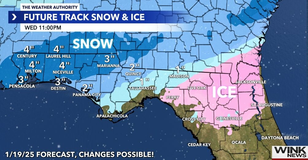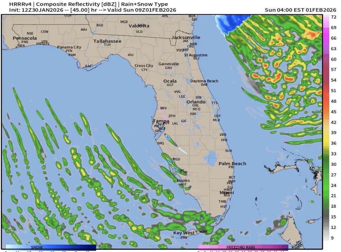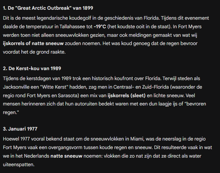 Toen viel er inderdaad sneeuw in de noordelijke counties. Nu wordt er zelfs tot aan Fort Myers winterse neerslag berekend. In 1989 zouden ze daar eens een mix van ijsregen/korrelsneeuw gezien hebben en in 1977 natte sneeuw maar nog nooit droge sneeuwval.
