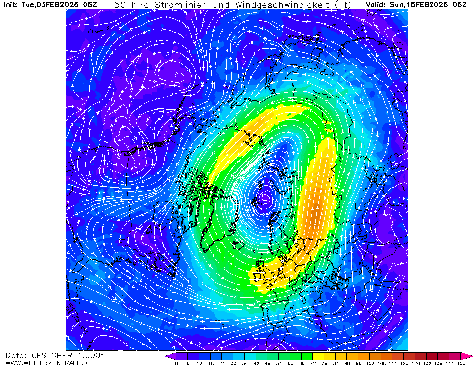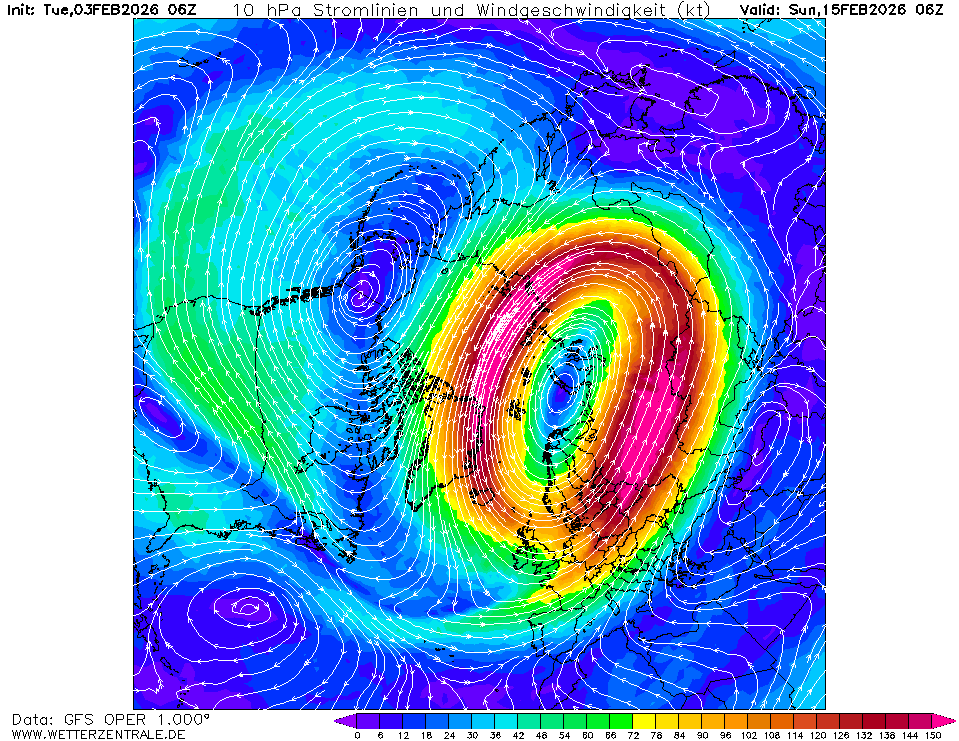 Hierbij zien we inderdaad ook een restvortex afsplitsen over Canada welke in betekenis voor ons weer afneemt. De dominate vortex ligt echter bij Nova Zembla. Deze kan op termijn nog sturing geven aan ons strominsgpatroon in de troposfeer. Maargoed, nu kijken wel wel naar +288 dus het zou kunnen zijn dat de restvortex op termijn toch nog een rol kan krijgen.