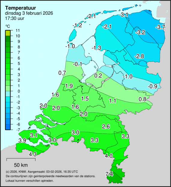 Terwijl bijvoorbeeld de temp. In Twente gestaag daalt blijft deze in Hupsel stationair boven 0.