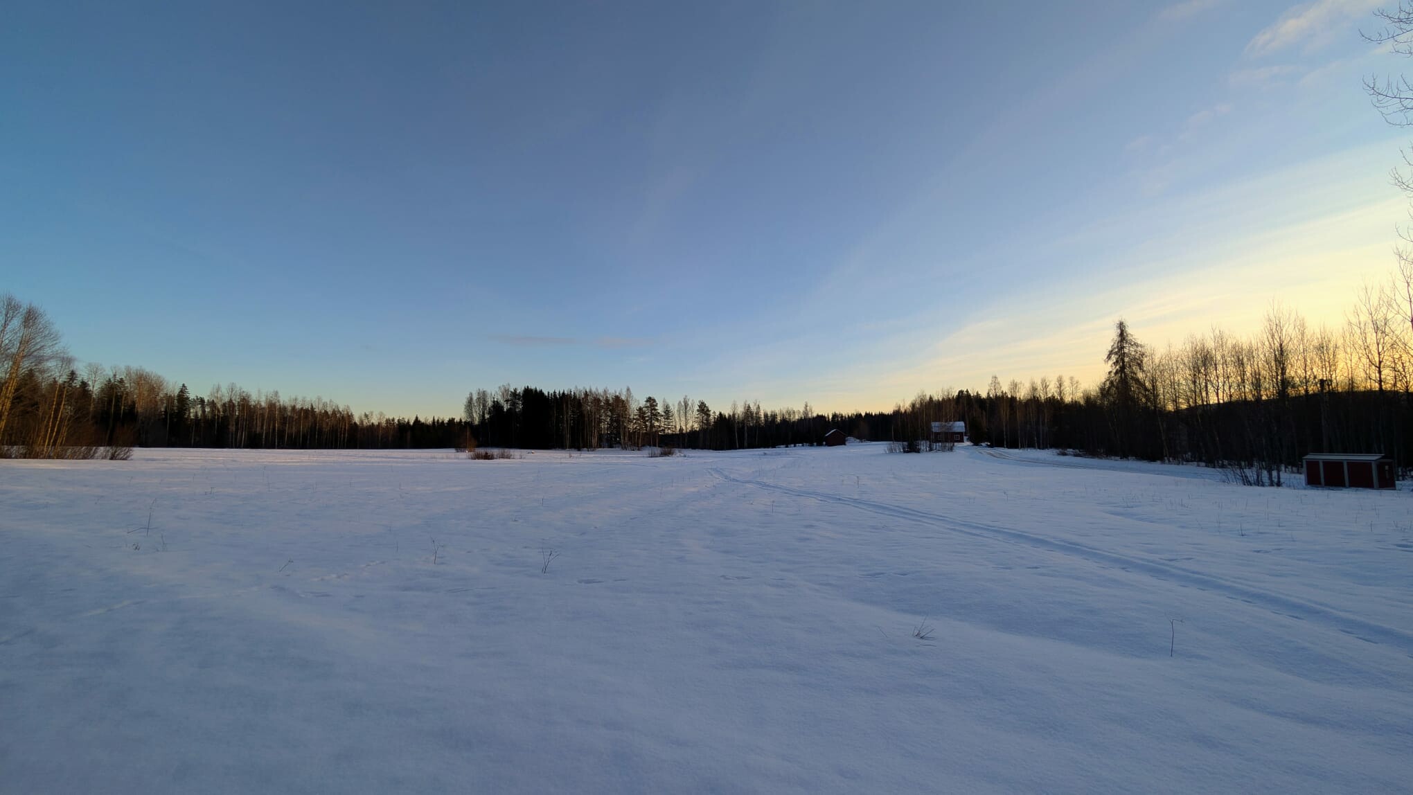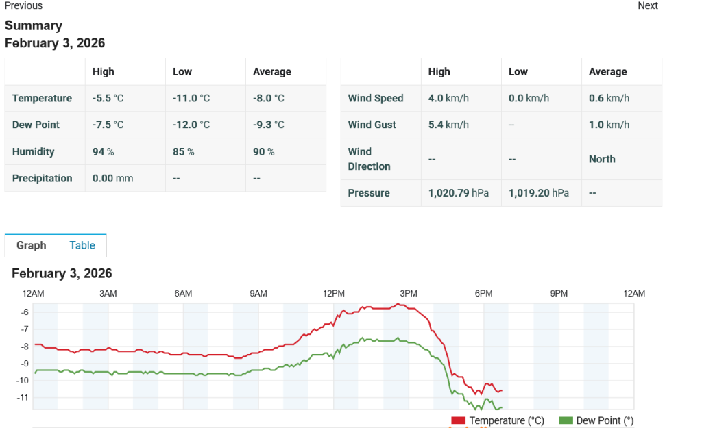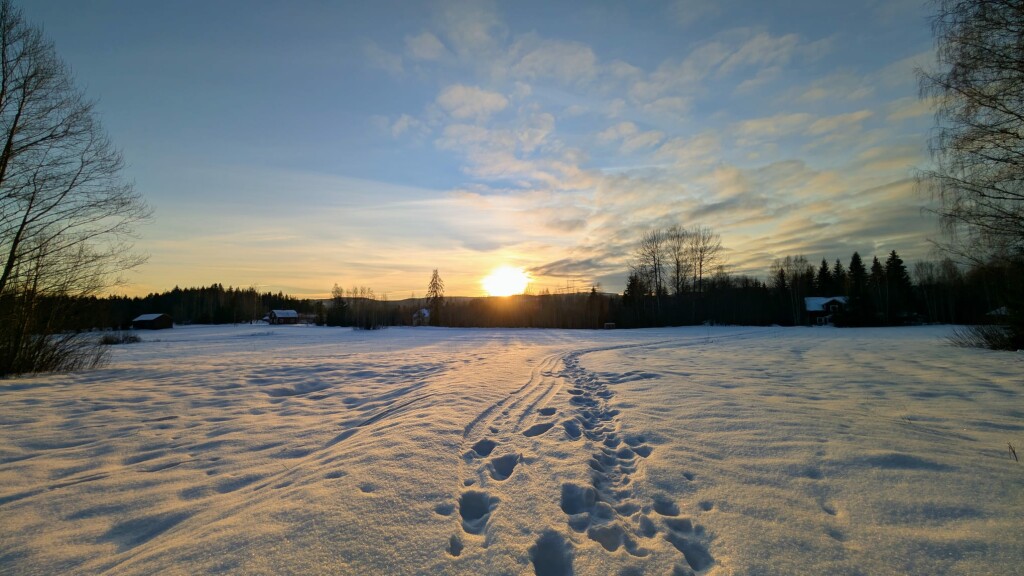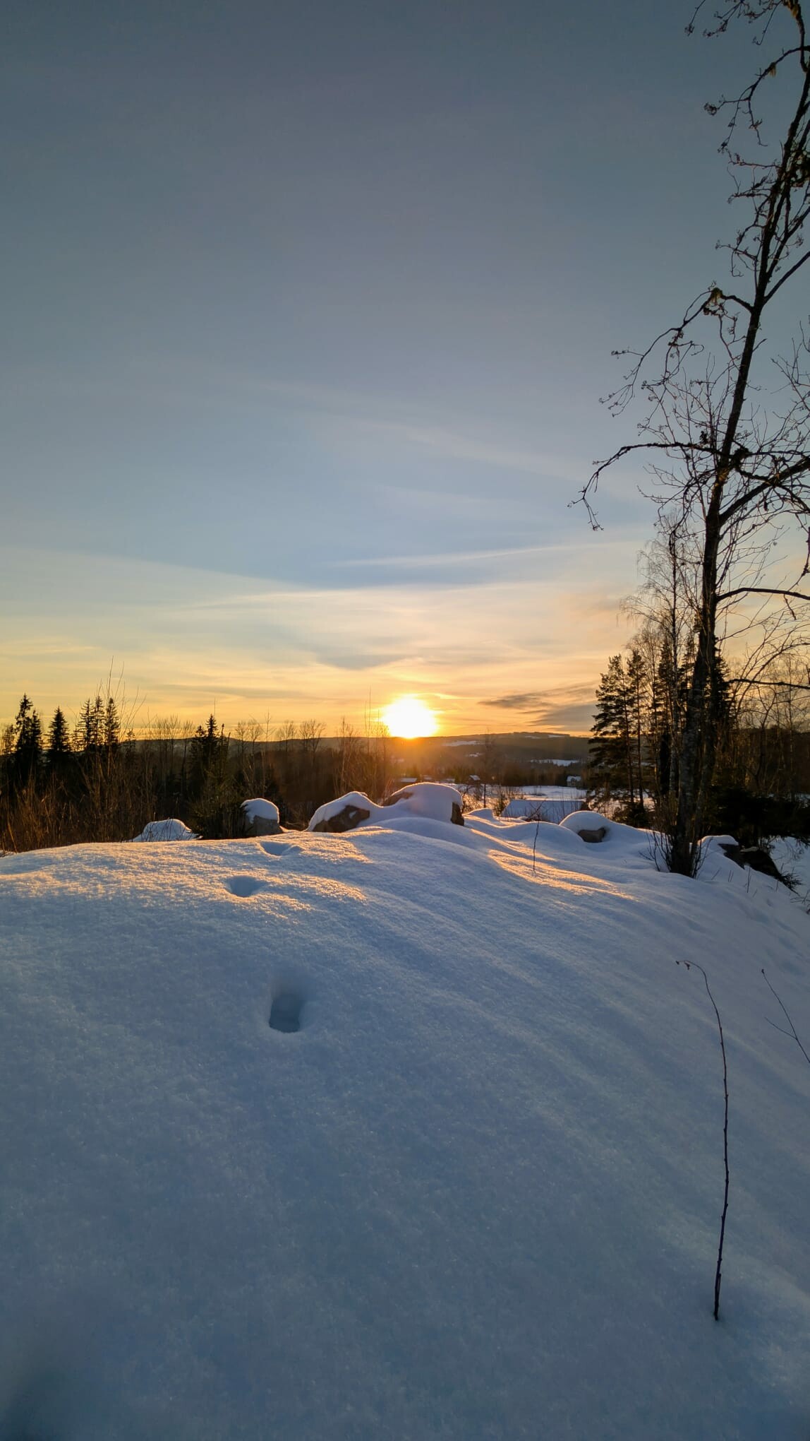 Na tenminste 3 dagen lichte sneeuwval, waarvan alles verdampt of wegwaait, klaarde het eind van de middag net voor zonsondergang op. Ik was net klaar met de studie, dus ik kon de zon nog even meepakken. De laatste sneeuw dwarrelde nog naar beneden, terwijl de lucht blauw was en het licht ook blauw kleurde, wat zo typisch is bij zonsopkomst/zonsondergang, als er sneeuw ligt. Ik was niet heel goed aangekleed kwam ik al gauw achter, want de temperatuur daalde als een baksteen van rond de -6 om 15:30 naar rond de -10 rond 16:45 (zie plaatje van het weerstation).