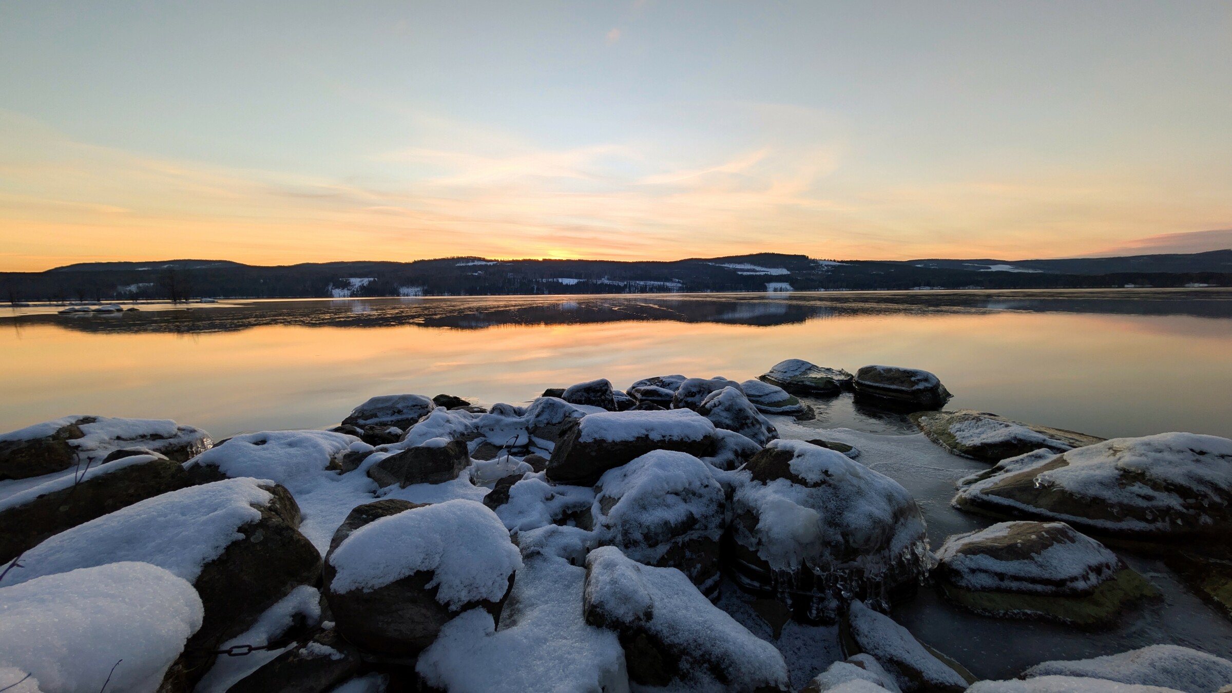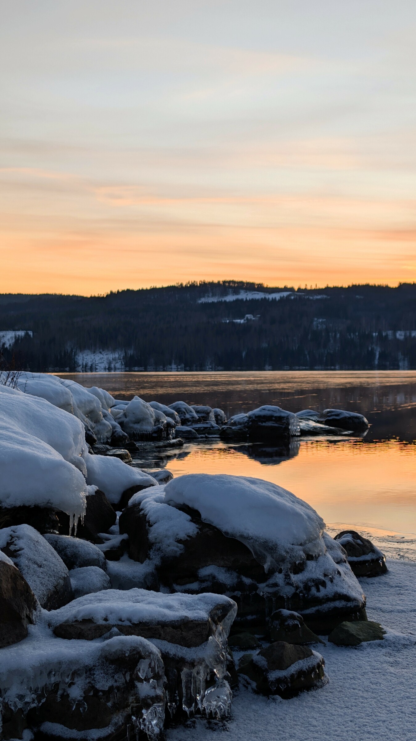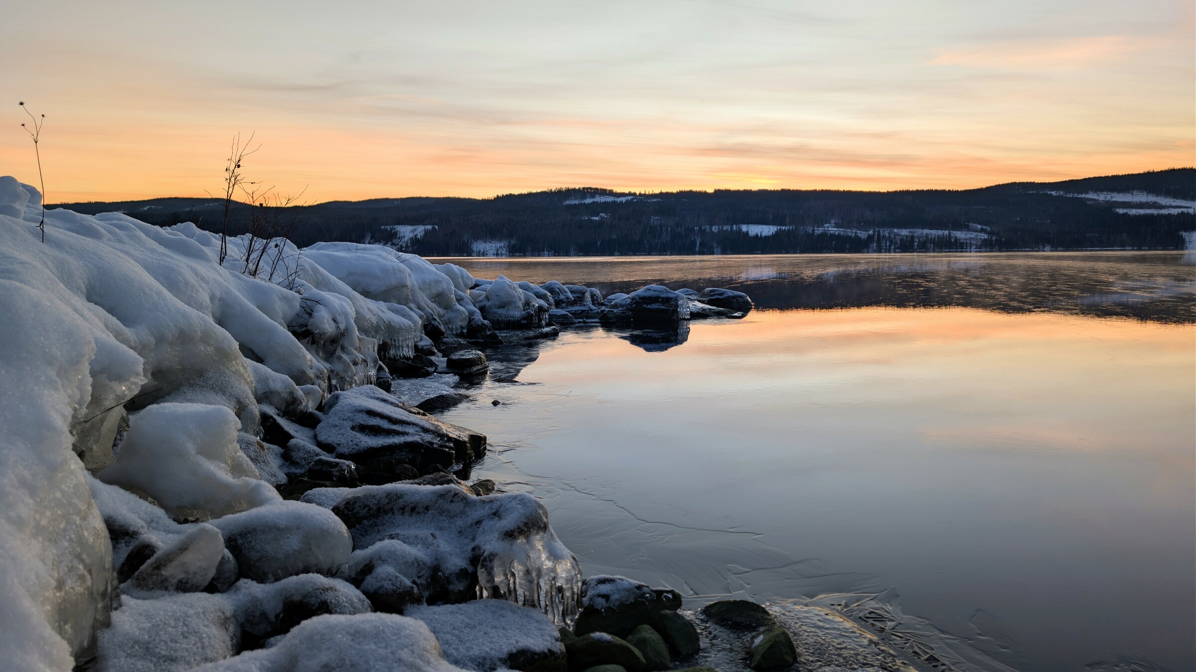 Het frykenmeer bevriest zelden helemaal, alleen in hele strenge winters naar het schijnt, mede omdat het frykenmeer tot 135 meter diep is en 80km lang. Daardoor staat er altijd stroming en verschilt het waterniveau per dag. Dit verschil in het waterniveau is vandaag goed te zien door de stenen die boven water komen te liggen met steeds een ijslaag op de steen welke het ''oude'' niveau aangeven. Dan te bedenken dat ik het zelfs met storm tot over het stukje land heb zien stromen door de golven