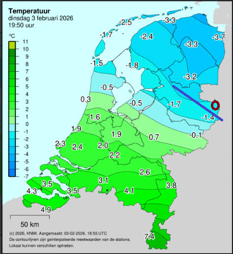 Het is hier in Denekamp momenteel -2,8 graden, vanaf 19:45 uur al.