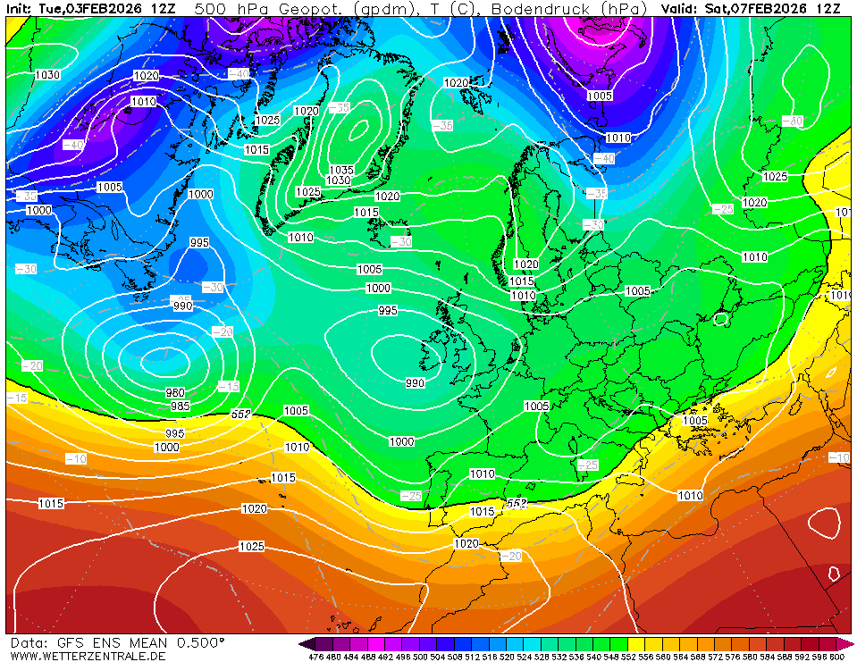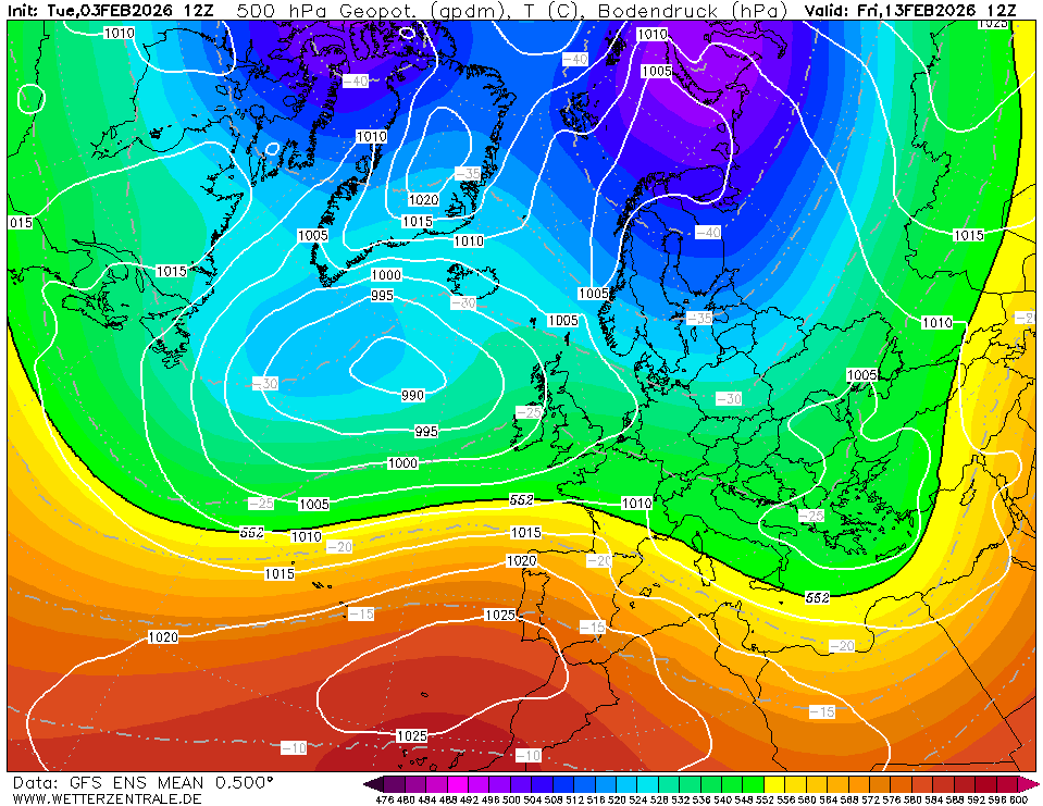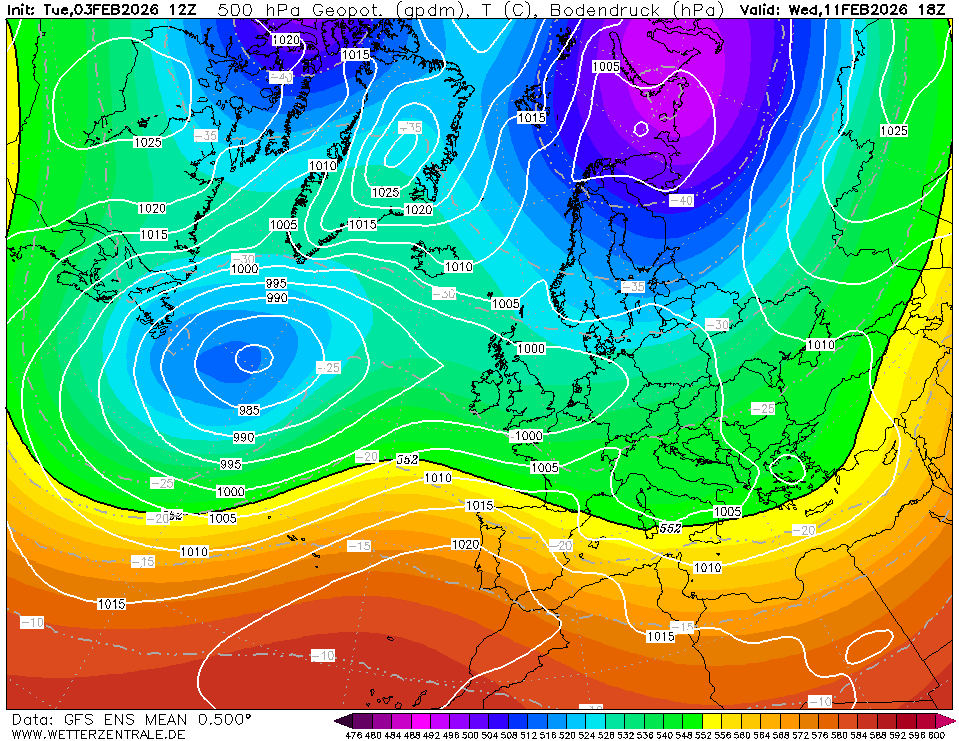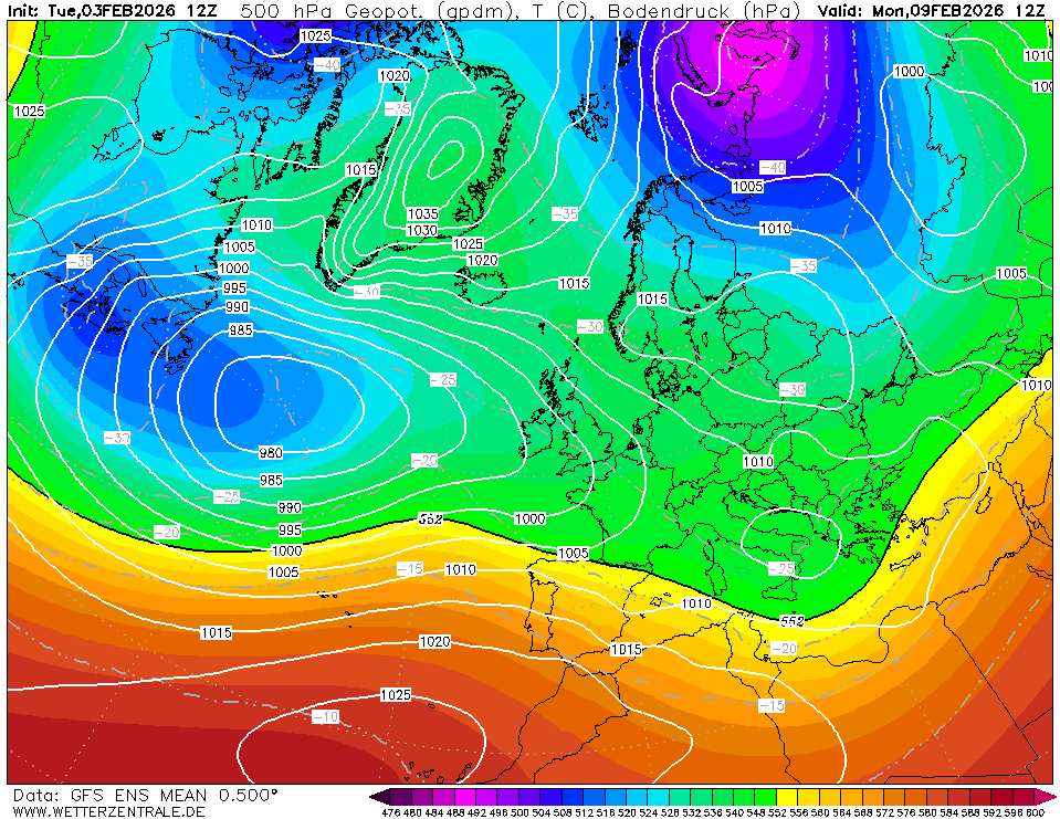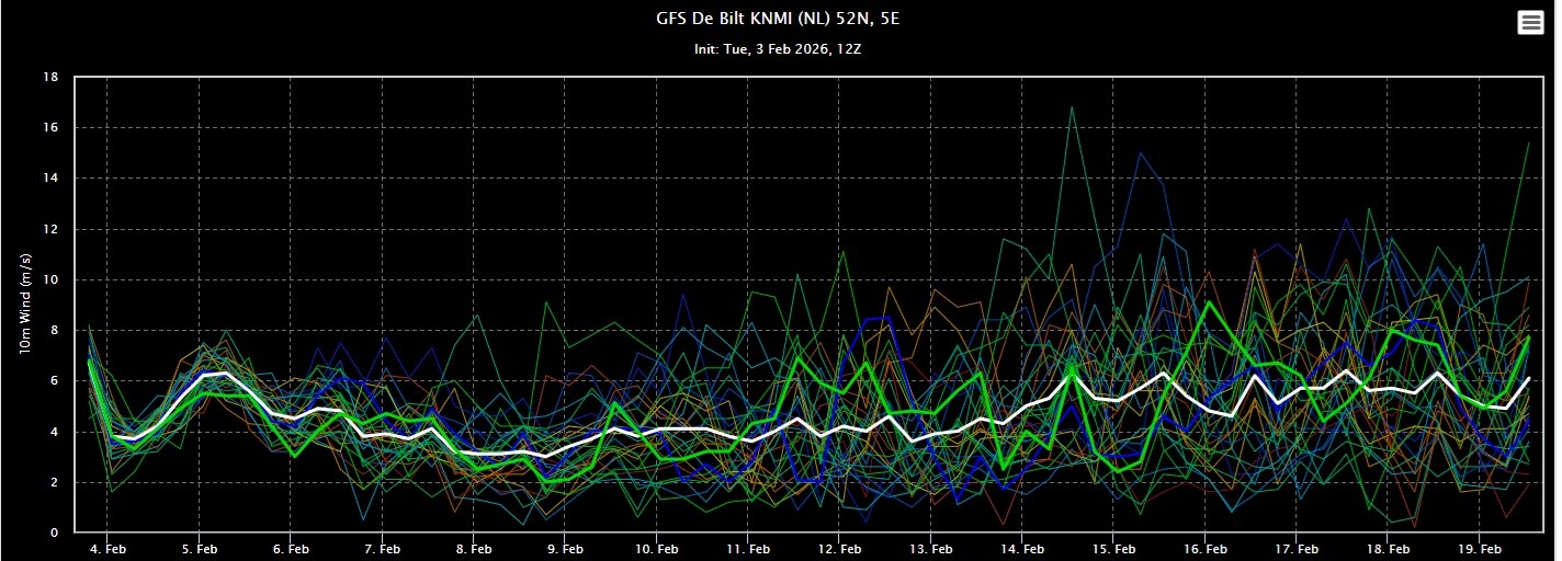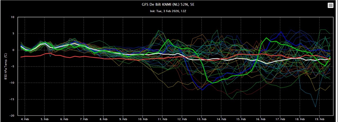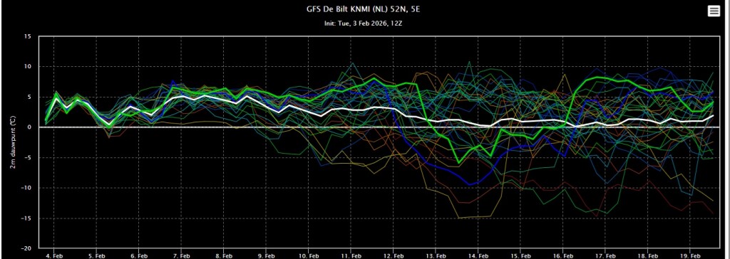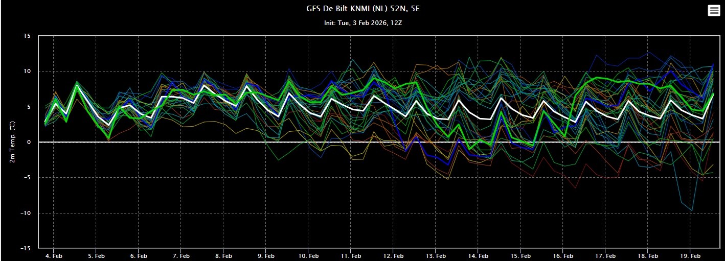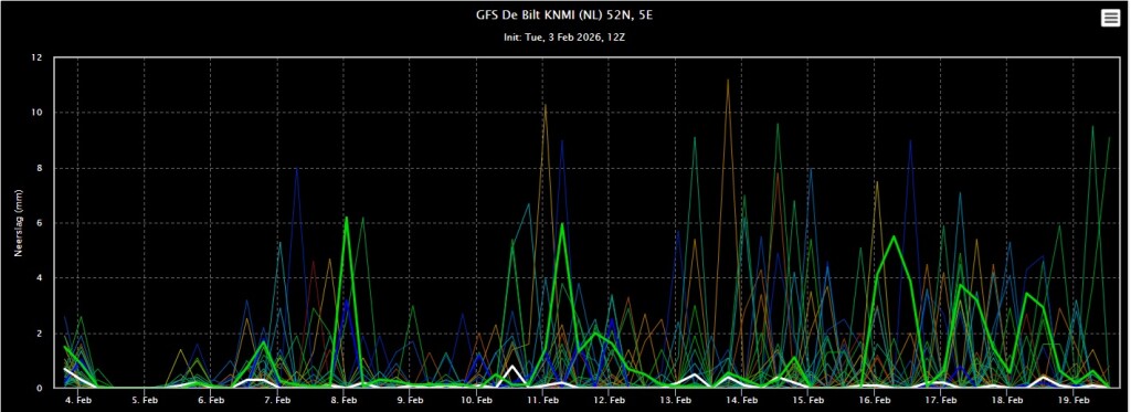 GFS ensemble gaat op de vrij zachte toer de komende periode. Daarbij valt geregeld wat regen. Het ensemble lijkt wel wat natter te zijn geworden.