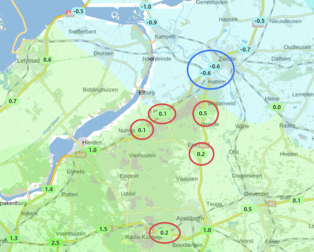 Diverse wegdektemperatuur meetpunten van Rijkswaterstaat liggen net iets boven of zelfs onder nul (knooppunt Hattemerbroek). Er komt ook een bui aan vanuit het zuiden. Tact -1,6ºC met tuineffect hier.