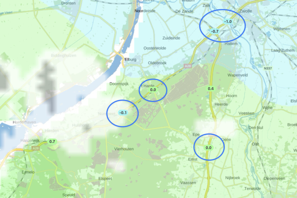 Op de Noord Veluwe inmiddels negatieve / dalende wegdektemperaturen en neerslag. Geen code geel op z'n minst?