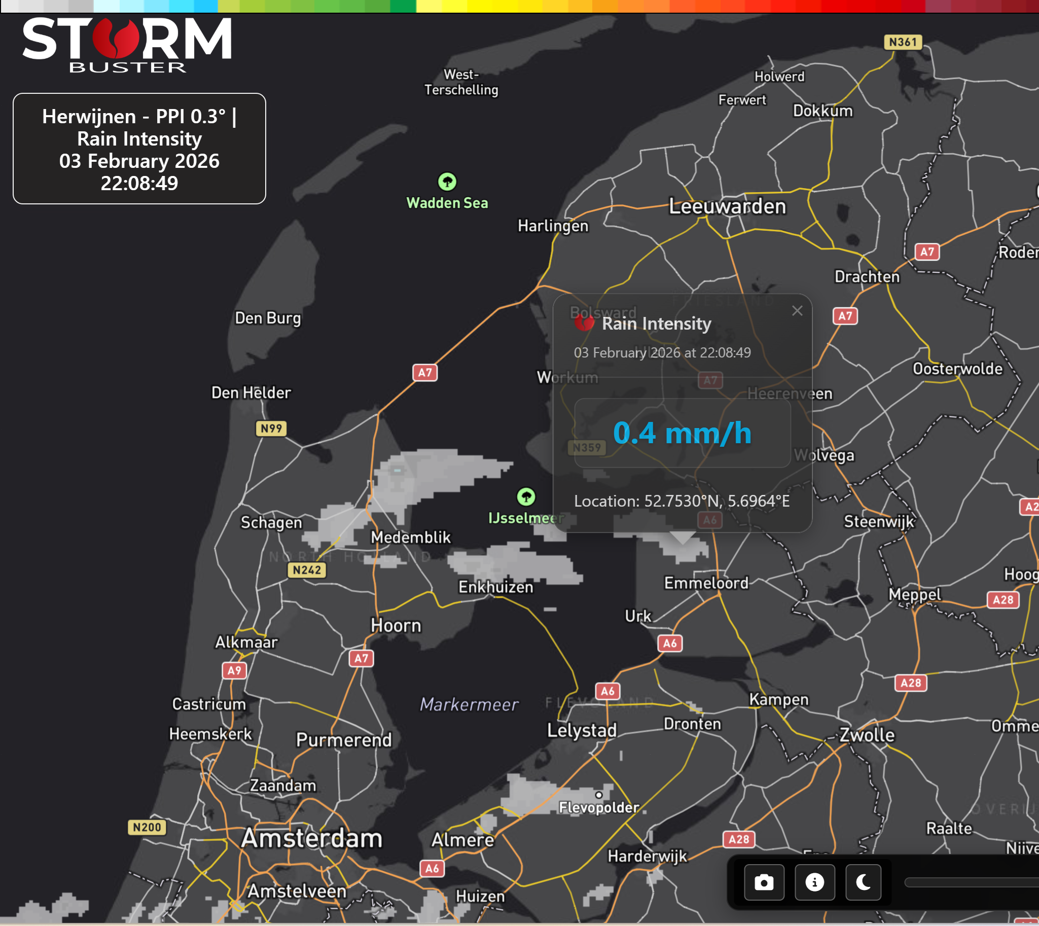 radar met een max. neerslagintensiteit van zo'n 0.4 mm/u. Het regent dan best aardig door. En er komt meer aan... GroetjesMichelZelf deze radar checken? Zie: https://dev.stormbuster.nl/