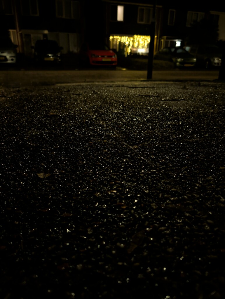 Erg glad op de stoep hier, auto’s onder dun ijslaagje