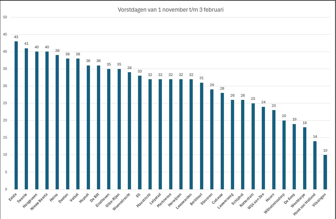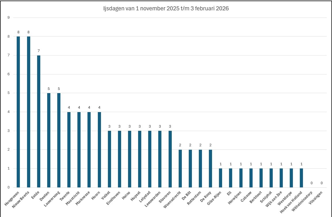 Met de vorstdagen gaat Eelde aan kop en met de ijsdagen een ex aequo tussen Hoogeveen en Nieuw Beerta.