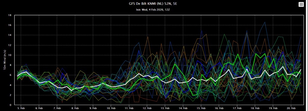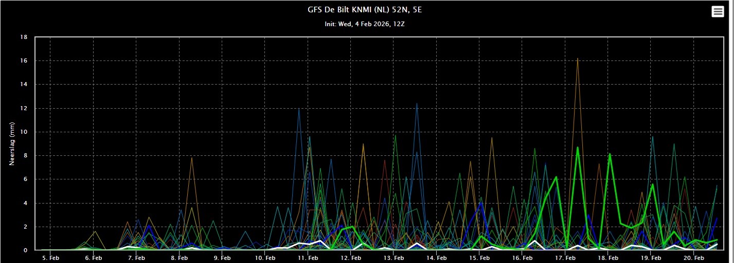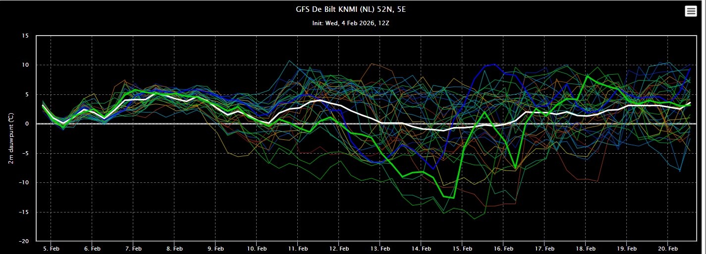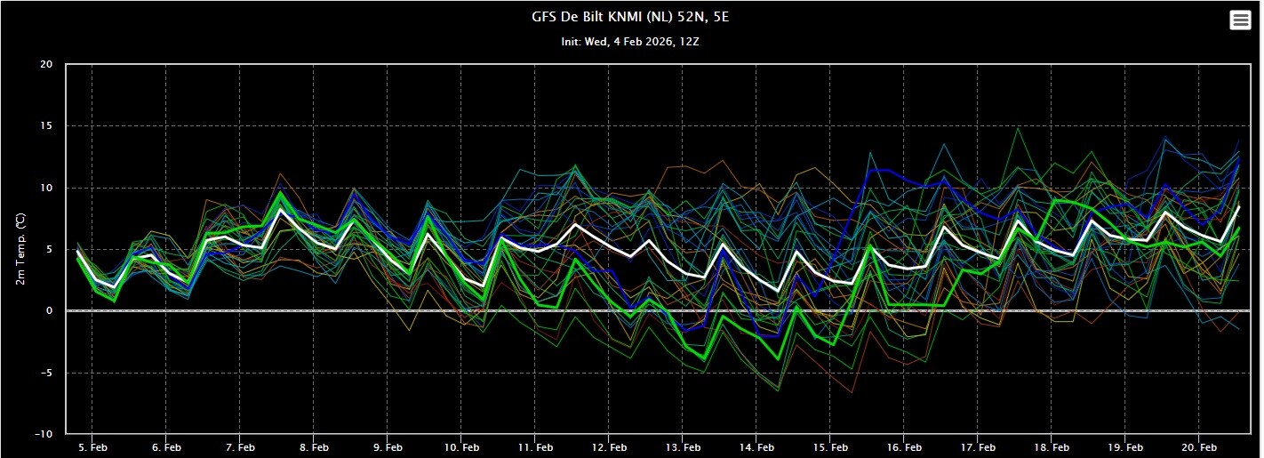 Vanaf 11 februari lijkt het op een bifurcatie waarbij de koudere en de zachtere leden redelijk goed verdeeld zijn. Tot 11 februari liggen de temperaturen binnen het bereik van wat normaal voor de tijd van het jaar is.