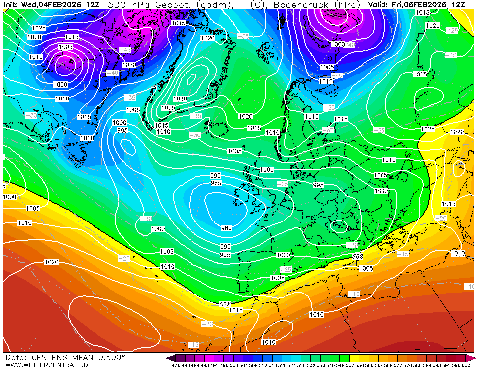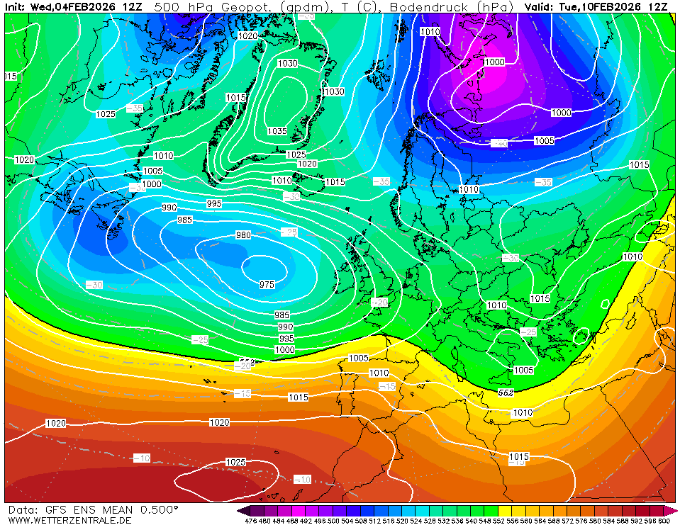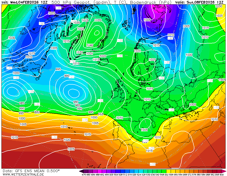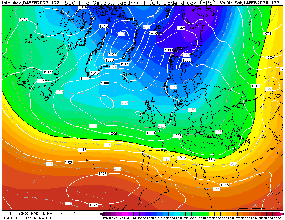 We zien op de weerkaarten dezelfde grootschalige setting met lagedruk ten zuidwesten en hogedruk ten noorden. Daarbij is de invloed van het laag aanvankelijk groter dan van het hoog. Rond zondag zien we een aparte kern boven Scandinavië ontstaan. Tegelijk trekt het laag zich wat terug en krijgt een apart filiaal boven de Middellandse Zee.