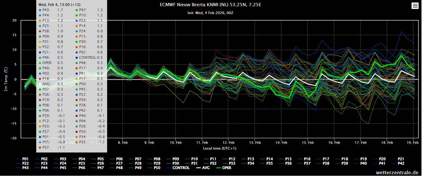 Op dit moment is er 10-20% kans op ijsdagen op meerdere dagen in het midden van het land (prikpunt Harderwijk), wat niet heel hoog is, maar ook niet kansloos. Ik zie vooral veel onzekerheid, verder zijn verrassingen niet uitgesloten. De werkelijkheid vandaag in Nieuw-Beerta is bijvoorbeeld 1.8°C kouder uitgevallen ten opzichte van het gemiddelde van de 00 UTC run van het EC-ensemble. De koudste leden kwamen op -1.1°C uit, wat nog altijd 0.4°C hoger is dan de werkelijkheid. Overigens geeft het ensemble niet de maxima weer, dus het verschil is nog iets hoger geweest tussen de berekeningen en de werkelijkheid.