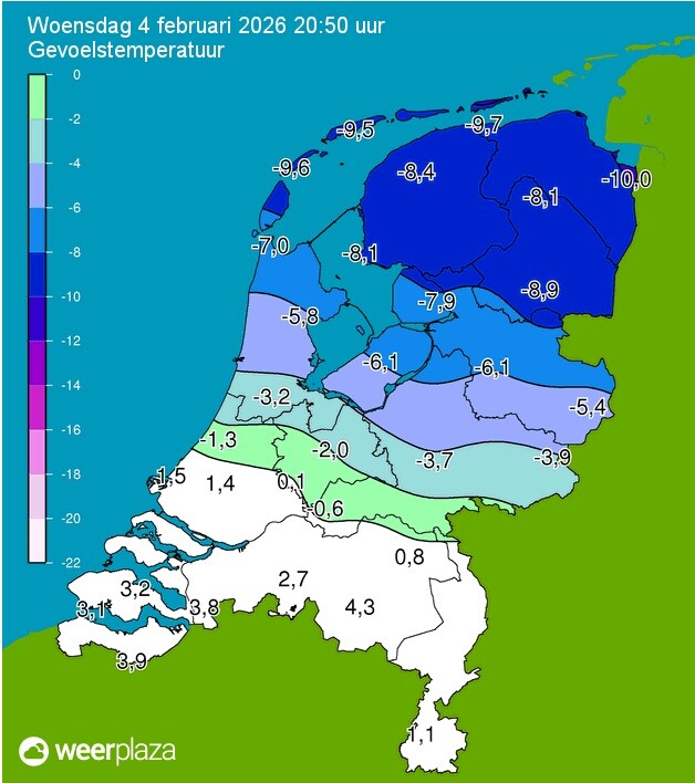 Rondje Tact: -3,4 °C. Gevoelstemperatuur rond -10 °C.