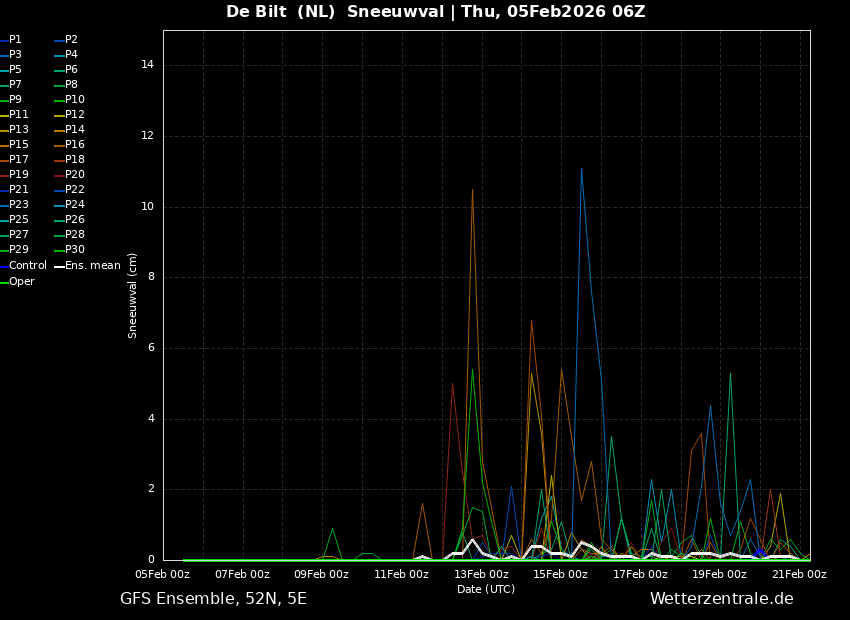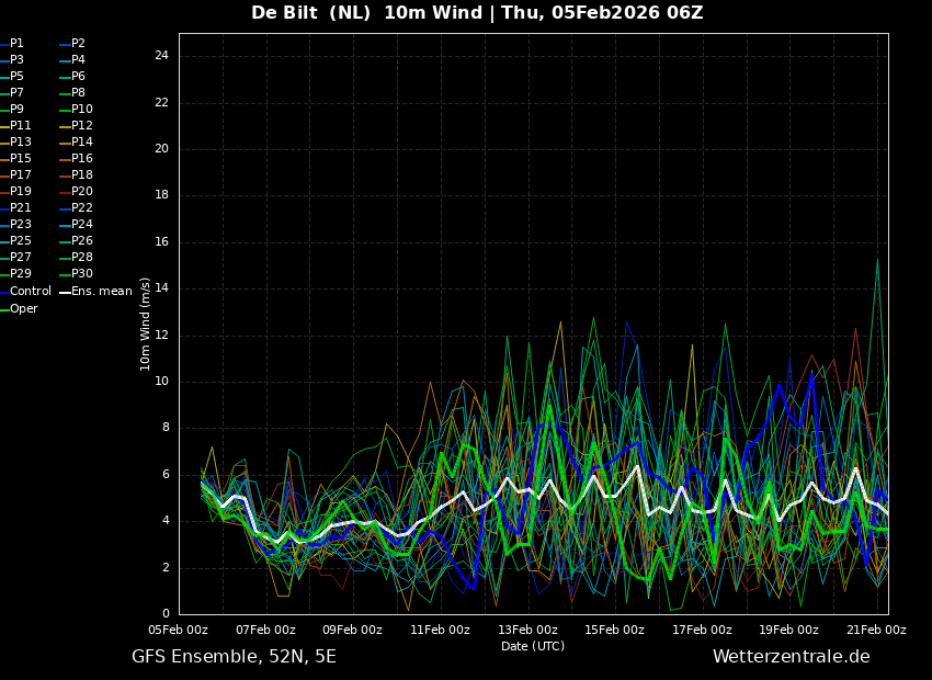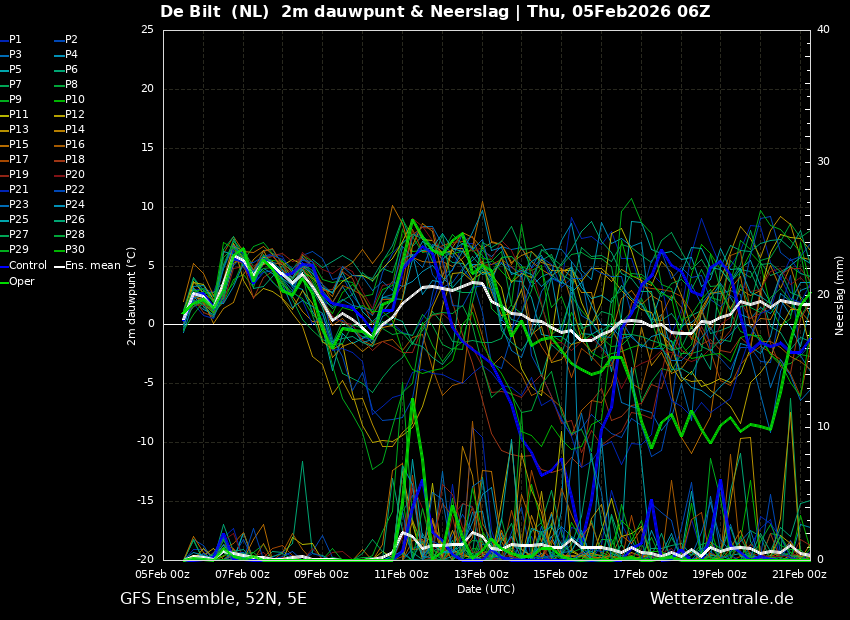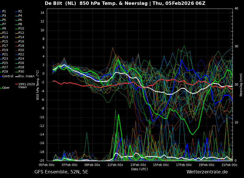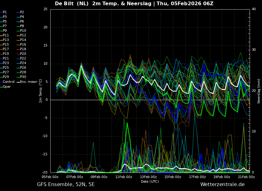 Net als in het ensemble van GFS0500, gaat ook dit ensemble behoorlijk op en neer.