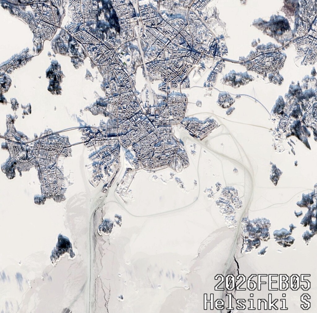 Ik kwam deze satellietfoto op X tegen van het centrum van Helsinki en omgeving. Hij is gisteren gemaakt, toen het stralend zonnig was hier. Het ijs gaat inmiddels nog een heel stuk zuidelijker dan op deze foto. Je ziet ook duidelijk de sporen van boten. Ik wou hem toch even delen.